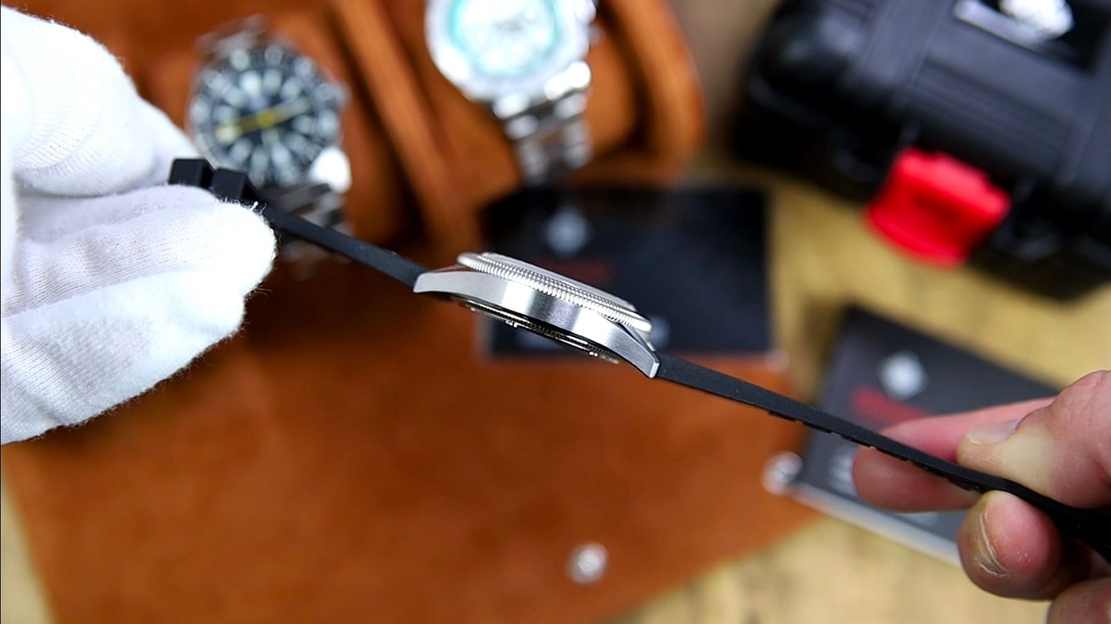 Because the bezel sits flush with the case and lacks deep ridges, grip can be a little tricky; most users will find themselves turning it by pinching between the lugs. It’s here that the watch’s only real flaw becomes apparent — the inner lug edges are sharp, a detail you notice when adjusting the bezel. It’s minor, but it stands out in an otherwise outstanding execution. Diver watch bezels watching out for this functional setup.