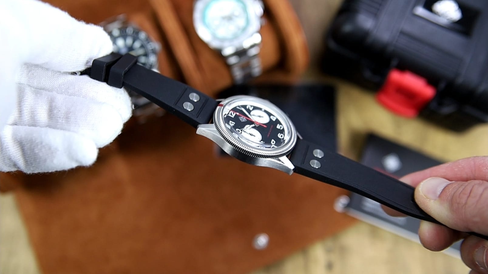The watch ships on a black rubber strap accented with two rivets per side, a nod to classic pilot designs. The rubber is soft, pliable, and comfortable, contrasting nicely with the case’s tool-grade steel. Quick-release spring bars make swapping easy, though a leather option might have complemented the watch’s vintage cues even better.