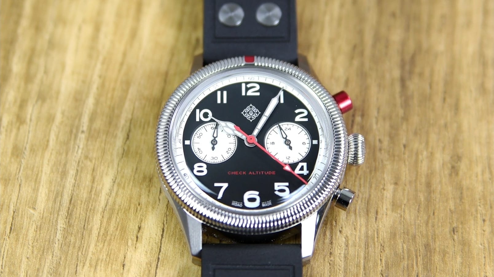 DialMatte black with white Arabic numerals, red accents, recessed subdials