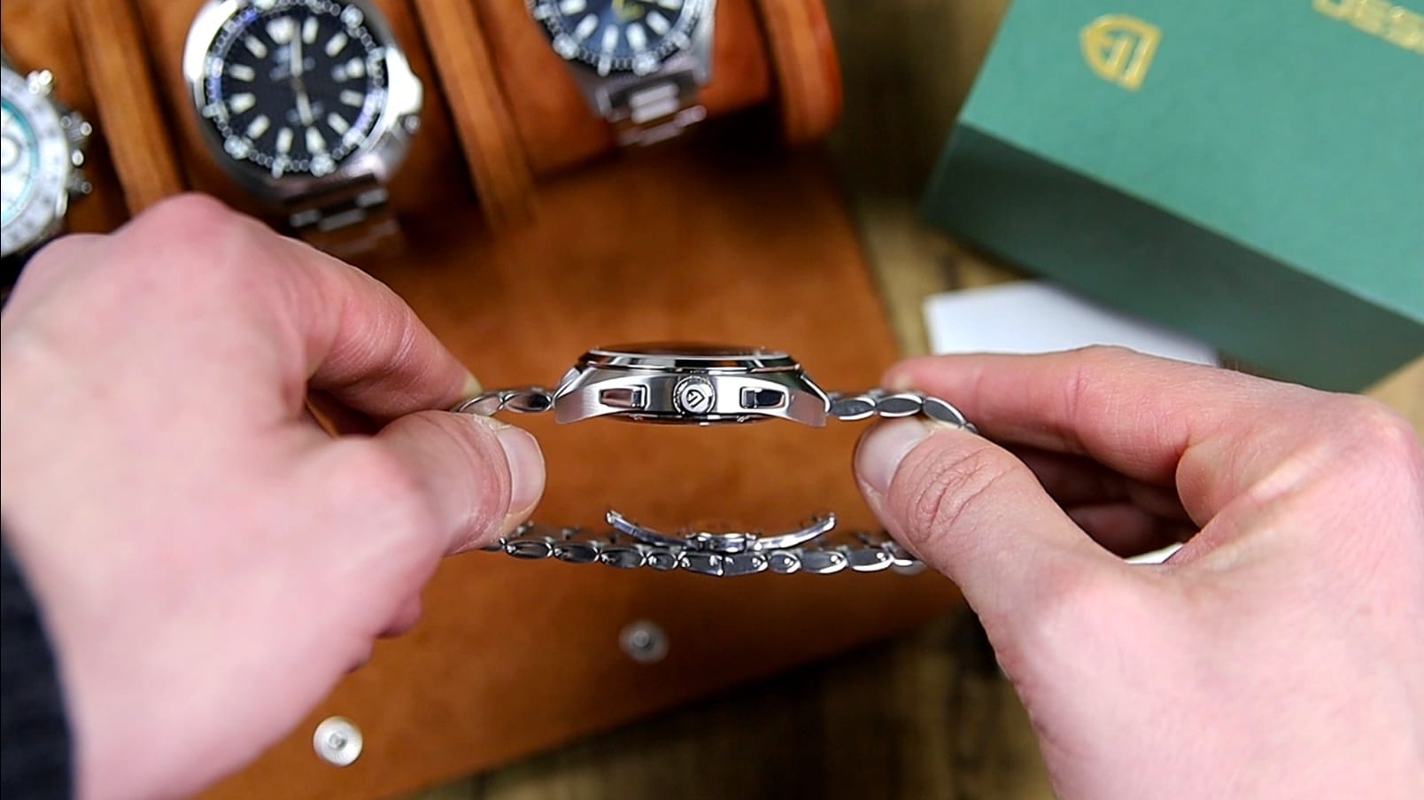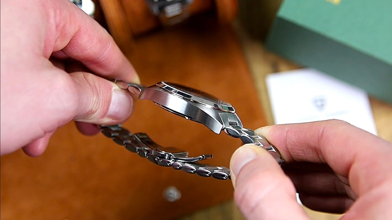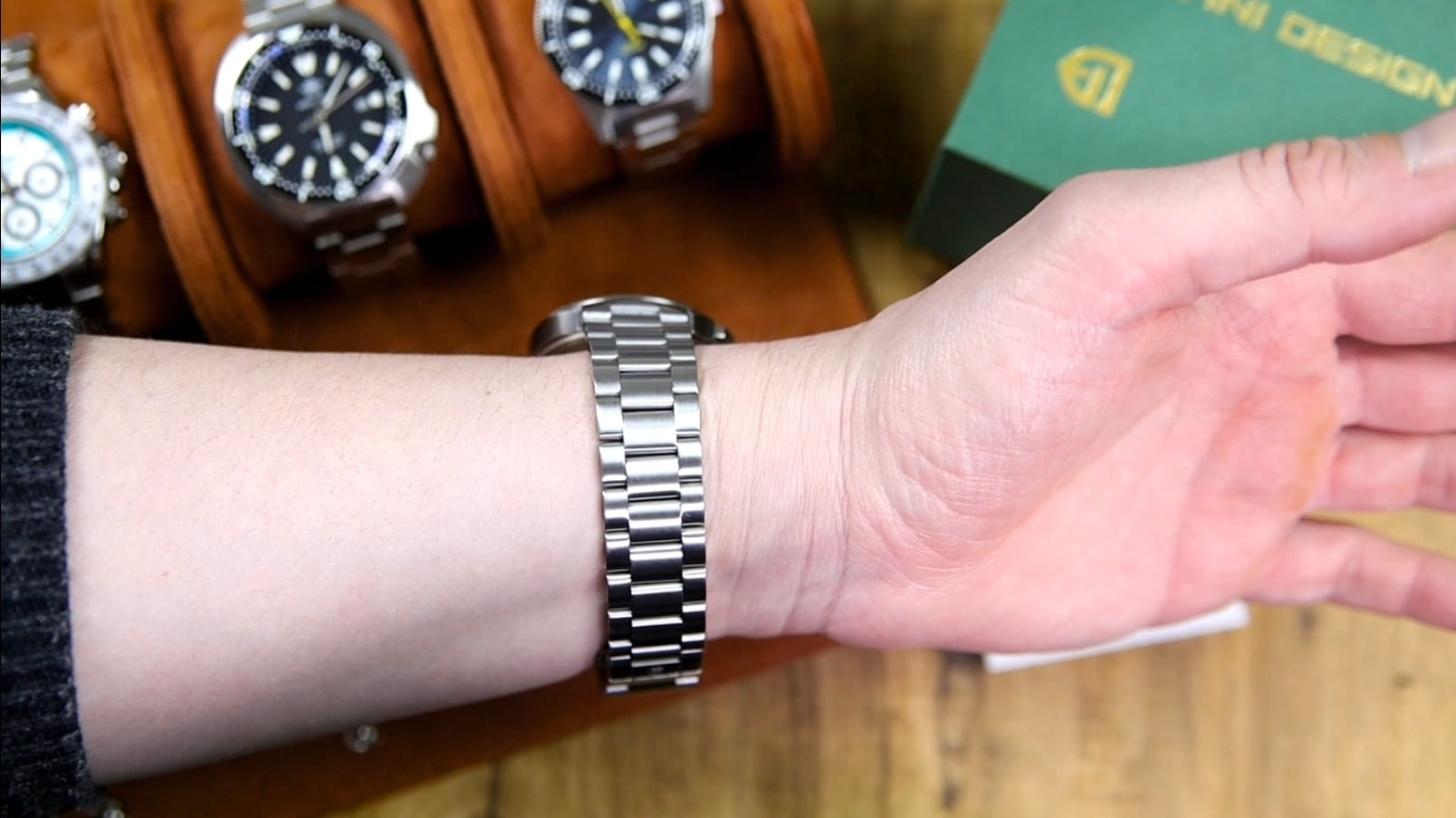 That addition allows for more precise sizing adjustments, which is rare at this price point. In motion, articulation is excellent, and the bracelet drapes naturally around the wrist. Under tension, visible gaps appear between the links, indicating average tolerances, but this does not affect comfort.