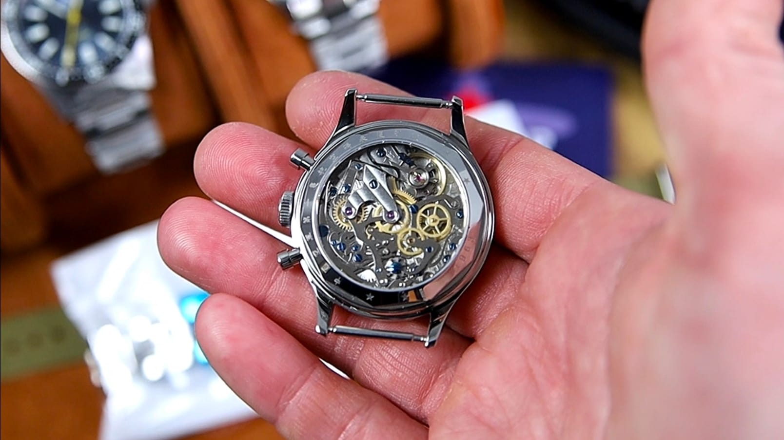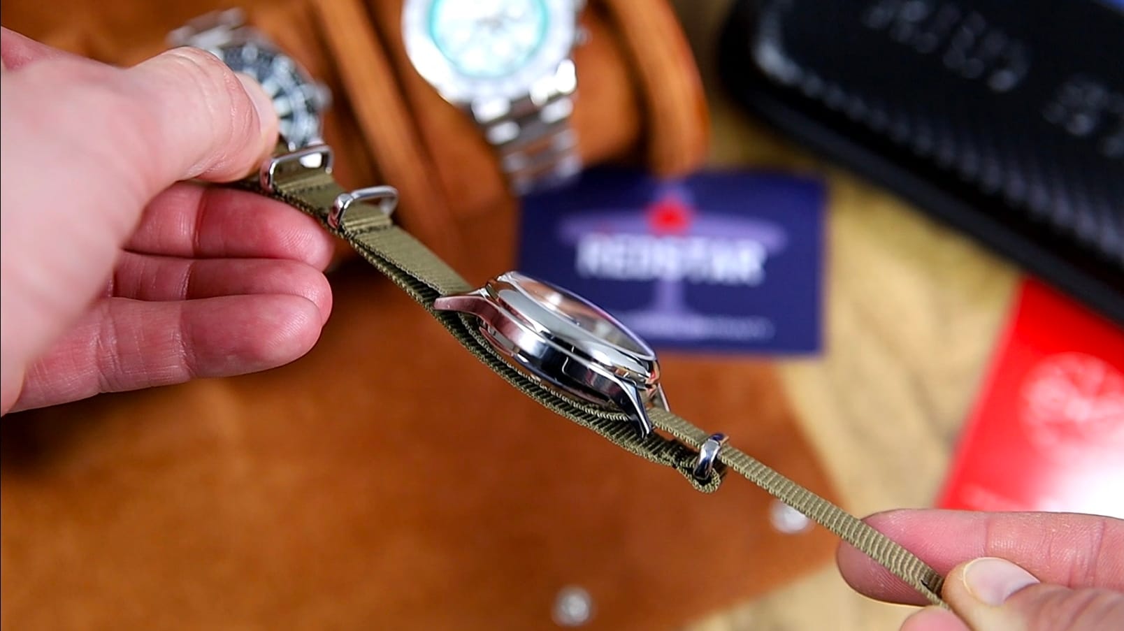 This bundle also includes a tan leather strap and a stainless-steel bracelet. The leather strap features quick-release spring bars but feels synthetic and lacks branding or genuine-leather markings. The bracelet uses push pins and a butterfly clasp; while functional, it is extremely light and offers little refinement. In practice, the watch benefits from being paired with a more substantial third-party strap to better match its historical character.