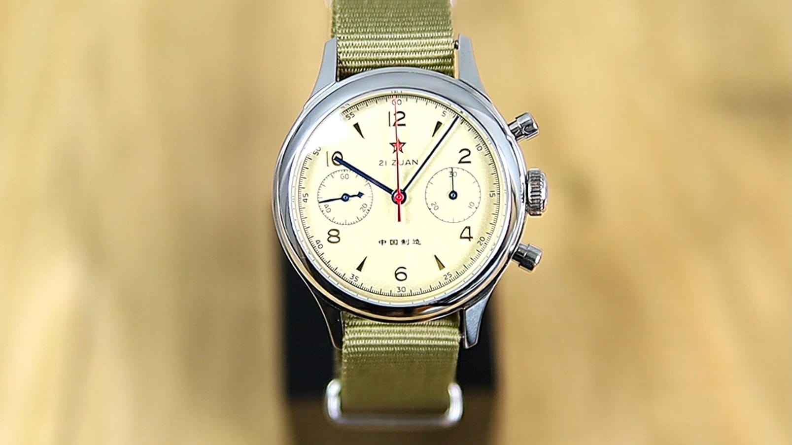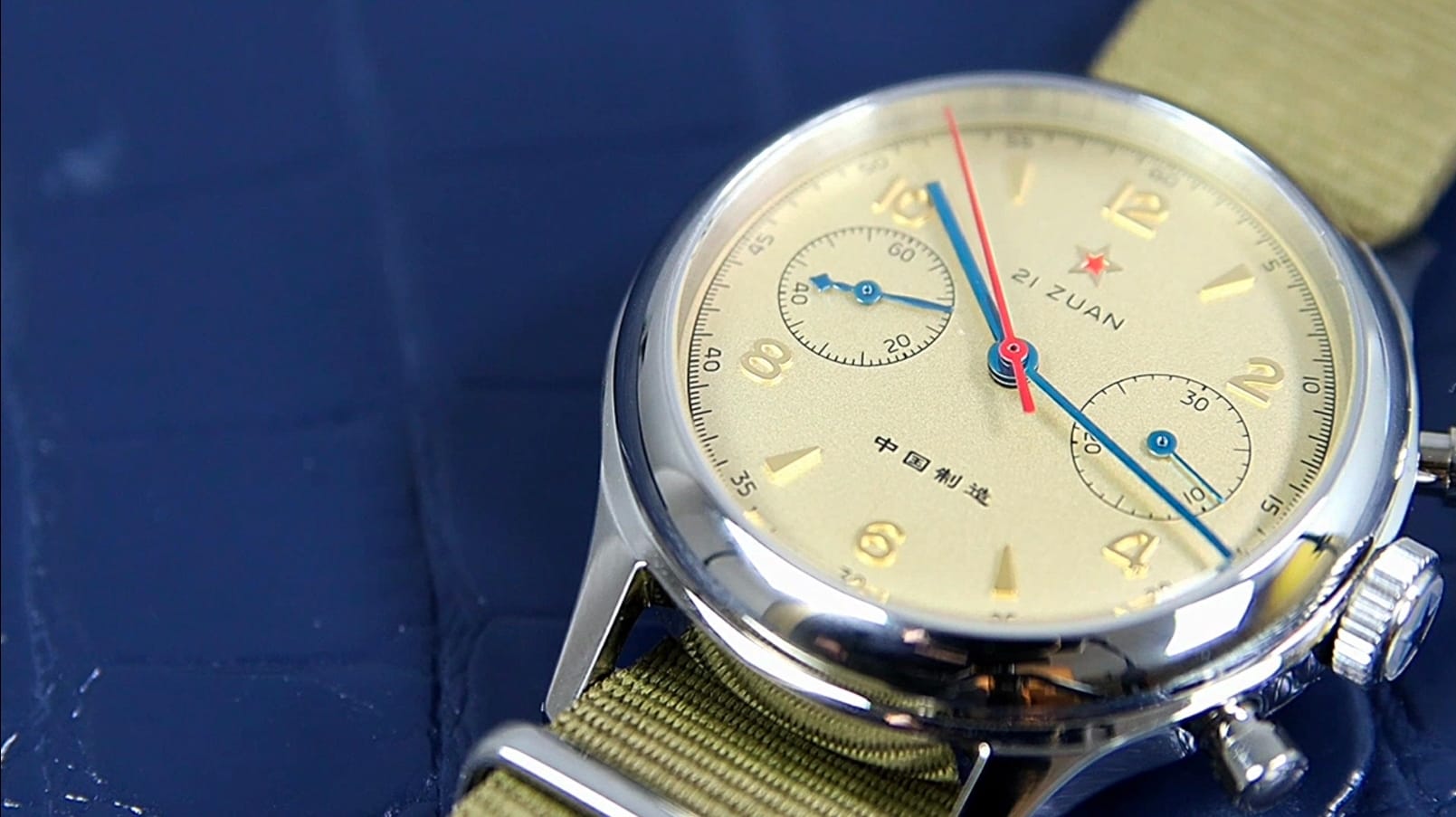 At 3 o’clock sits the 30-minute chronograph counter; at 9 o’clock, the running seconds. Both are printed with crisp black tracks and fitted with blue-chromed hands. The main hour and minute hands are also blue-chromed, while a long red chronograph seconds hand sweeps nearly to the rehaut at six beats per second. Branding is minimal: a red star beneath 12, “21 J” below it, and Chinese script at six reading “Made in China.” The dial does not shout luxury—it quietly communicates provenance.