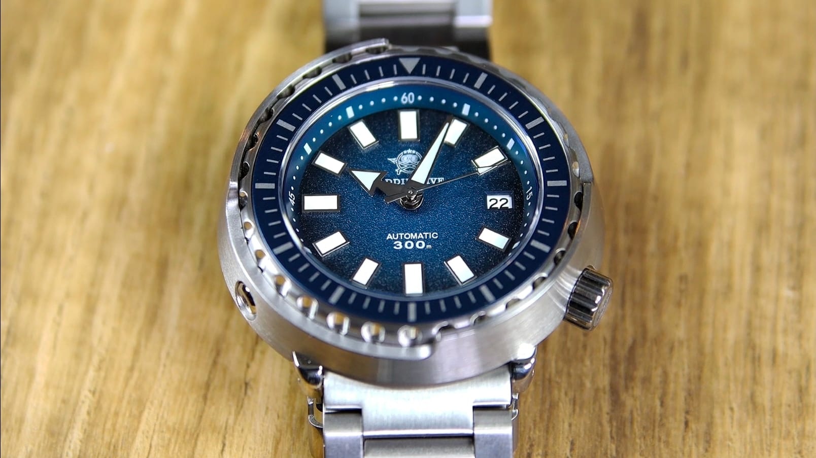 Construction is fully brushed stainless steel, including both the case and bracelet. The tall horizontal brushing on the case flank continues seamlessly into the protective shrouds that frame the case. These shrouds rise along the sides and approach the bezel edge, reinforcing the familiar Tuna-style silhouette. At four o’clock sits a signed screw-down crown measuring 6.4 mm across, positioned in line with the case and well protected by the surrounding structure.