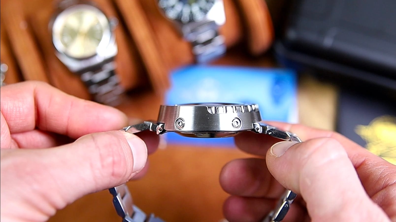 The bracelet connects through short underslung lugs that are unexpectedly polished. In practice these polished surfaces remain mostly hidden when the watch is worn, as they sit beneath the case and primarily serve as mounting points for the spring bars. Because of this, the change in finish does not disrupt the visual continuity between case and bracelet.
