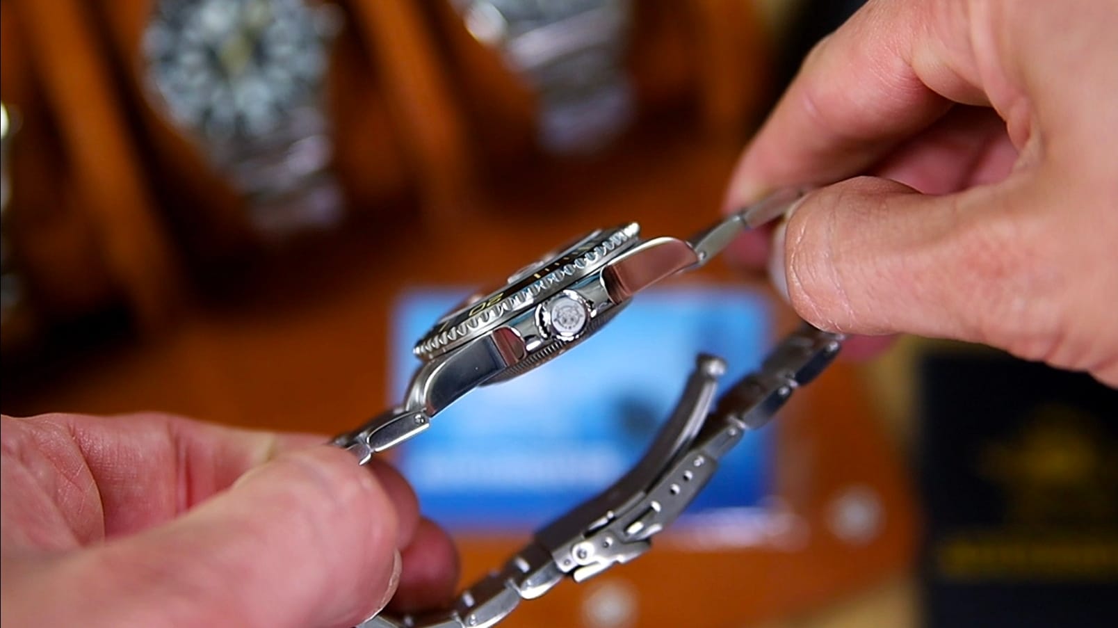 The case architecture reinforces that stance. The tall, flat case flanks are fully polished, giving the watch a strong vertical presence. Transitions into the brushed lug hoods are softened by smooth bevels, keeping edges crisp without feeling sharp. The end links share the same brushing as the lugs, creating a seamless visual integration between case and bracelet.
