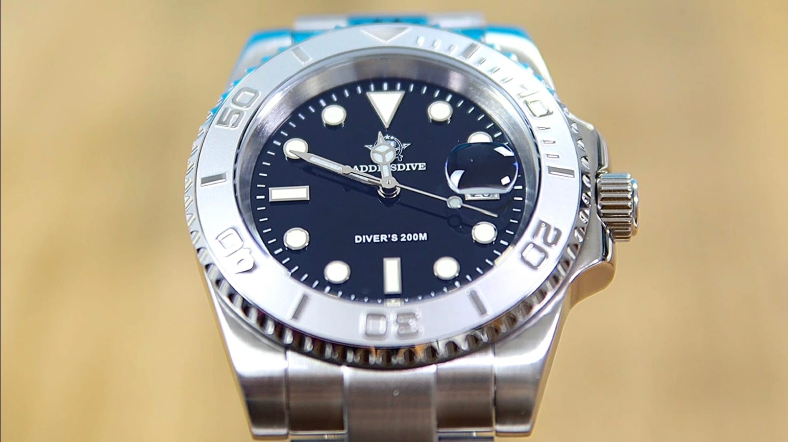 Top-down, the full stainless-steel timing bezel dominates visually, its embossed (not engraved) numerals giving the surface a sculpted, glossy appearance. The lug hoods fall away cleanly toward the bracelet, and because the tops of the lugs are brushed to match the three-link bracelet, the end links integrate almost seamlessly. From the side, the case shows classic Addiesdive proportions: tall, polished flanks that visually slim the profile, paired with lug tips that taper sharply and drive the bracelet downward to hug the wrist.