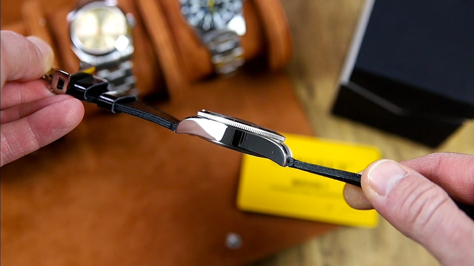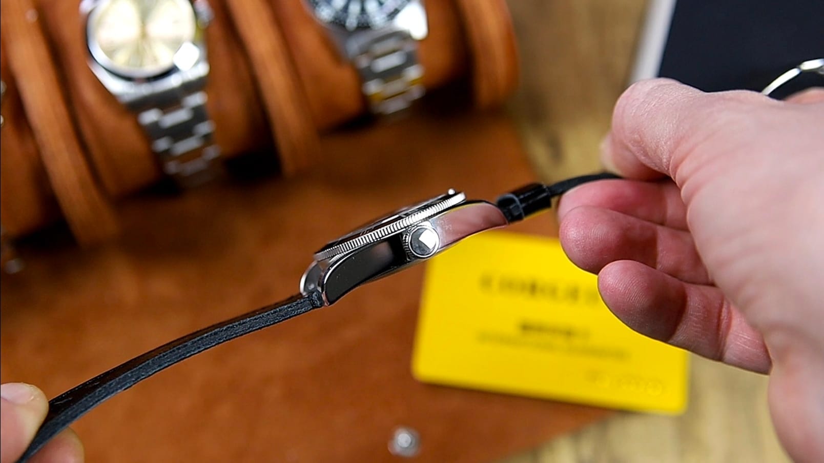 Instead of a traditional bracelet, the Corgeut 2010 is supplied on a black leather-look strap with neat black stitching and a classic taper. At first glance, it presents as polished leather, but it is leatherette rather than genuine leather.