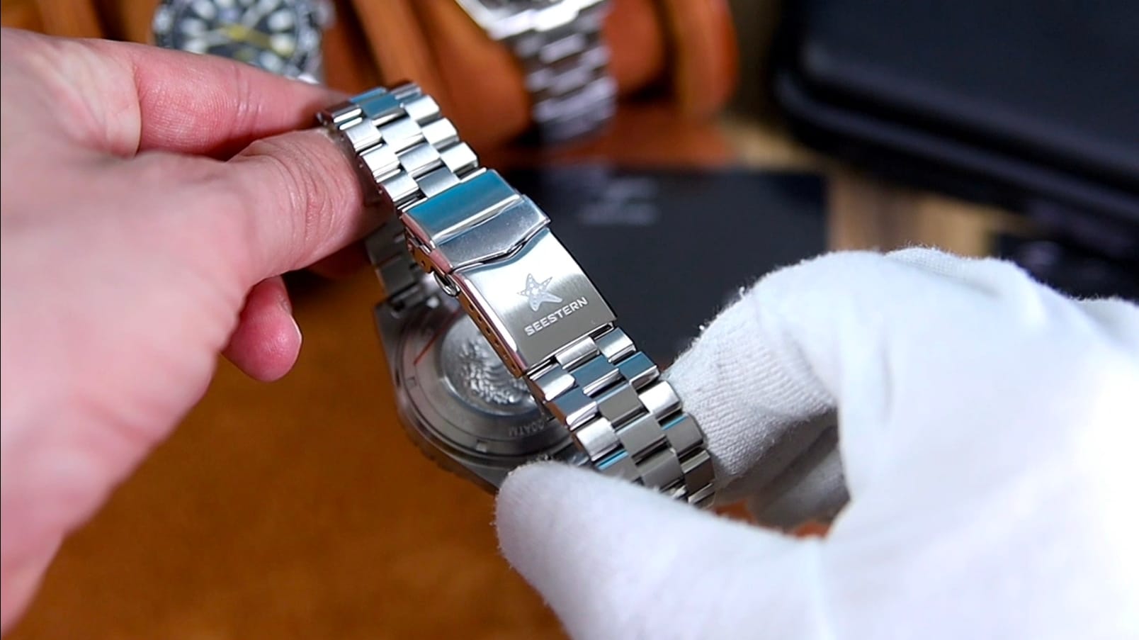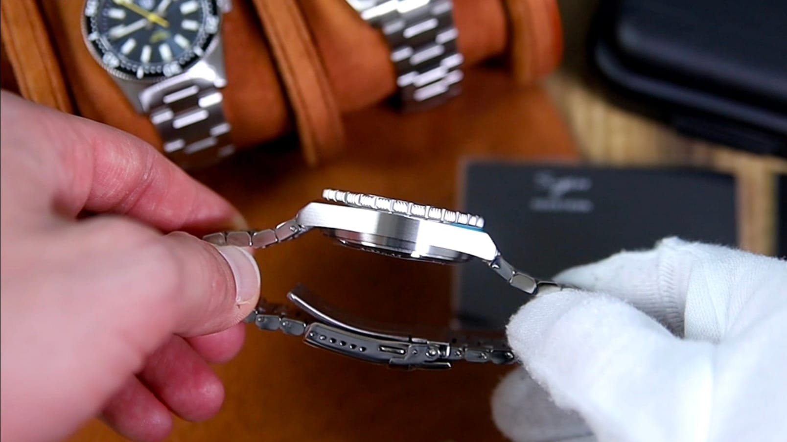 The clasp is a milled, double-pusher fold-over with six micro-adjust holes, giving practical fine-tuning and a sturdy, diver-appropriate feel. On the underside, the milled folding wing reinforces the clasp’s solidity.