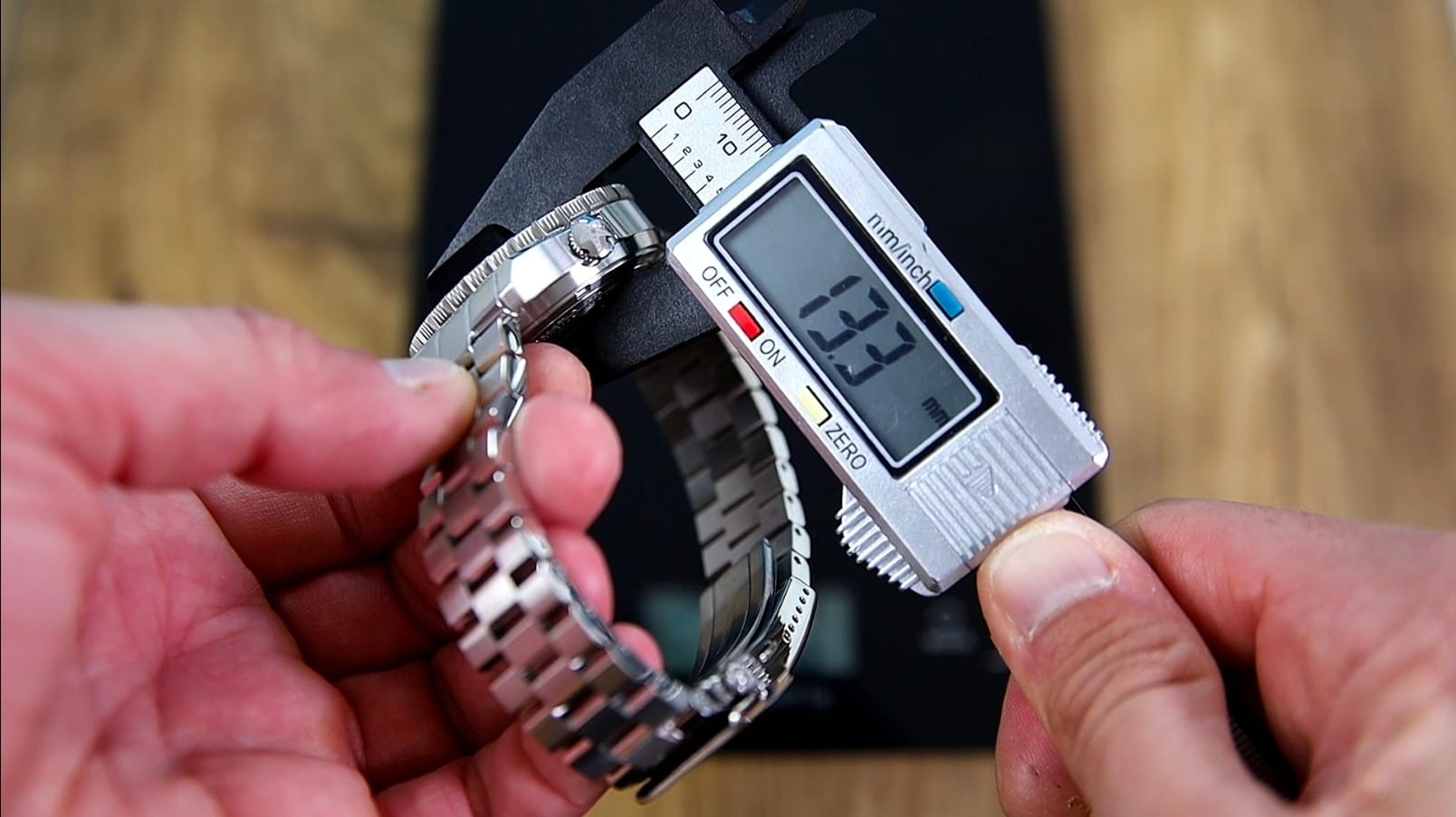 The Sub600T measures 40.2 mm in diameter, 13.3 mm thick, and carries a notably long 52.1 mm lug-to-lug. Although the numerical span sounds large, the watch does not wear as oversized as the figure suggests. This is due to the short, sharply sloped lugs, which drop steeply toward the wrist, giving the case a pseudo-integrated look and allowing it to sit securely even on a 6.5-inch wrist.