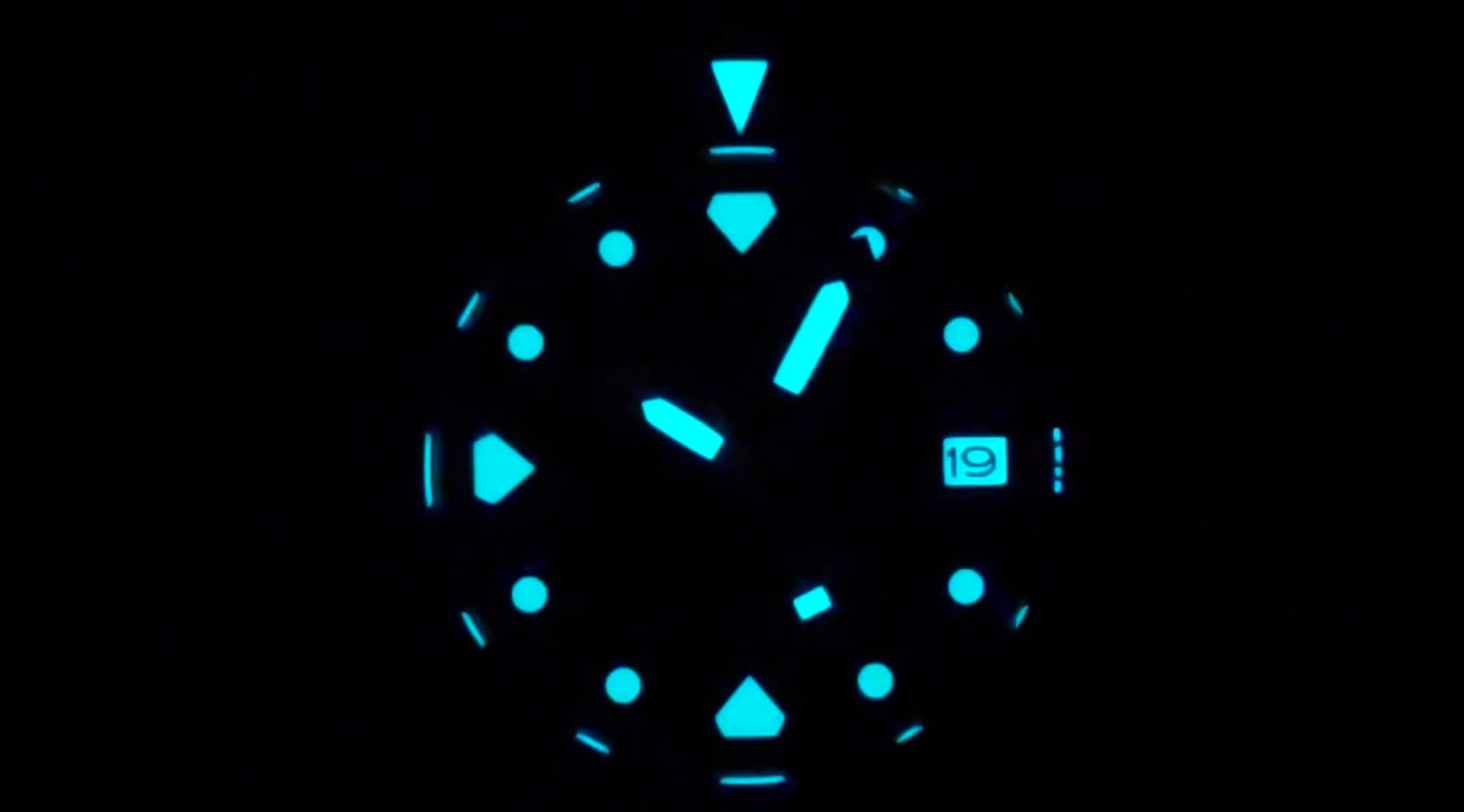 A defining feature of the Sub600T is the lumed date window at 3 o’clock. The frame is well proportioned, and the date wheel glows in the same blue tone as the indices — an uncommon detail at this price point.