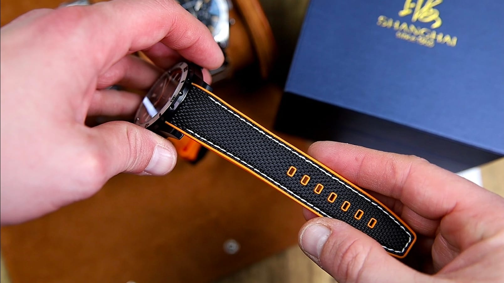 On the underside, the strap is textured and uses a quick-release system, allowing for easy removal and installation without tools. The buckle is a brushed PVD stainless steel unit, signed with the Shanghai logo, and matches the case finish for visual continuity.