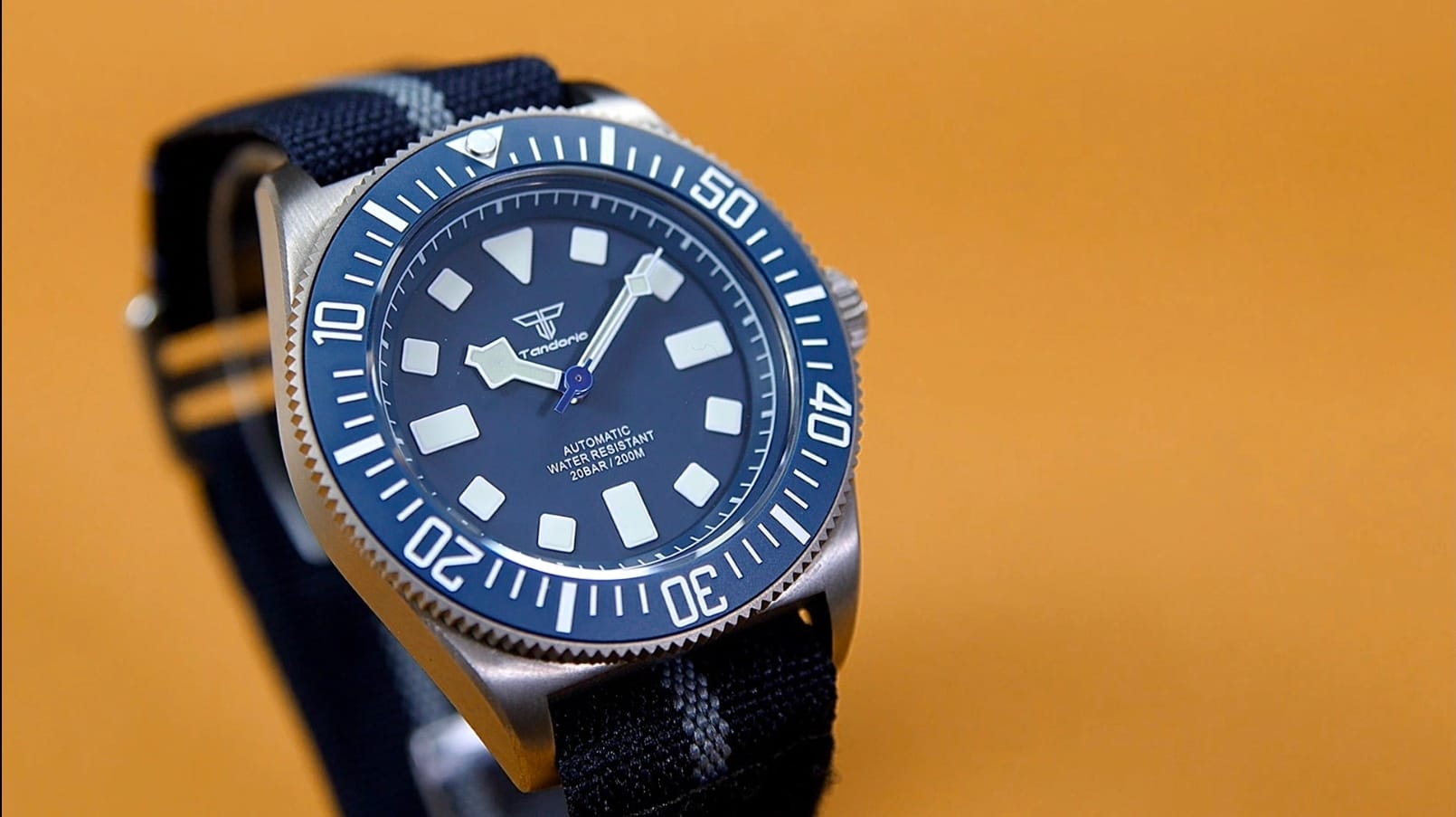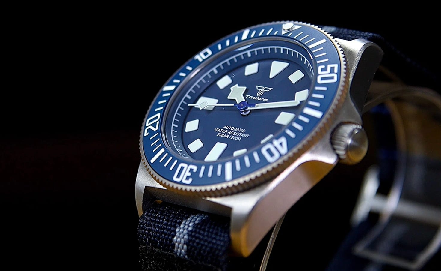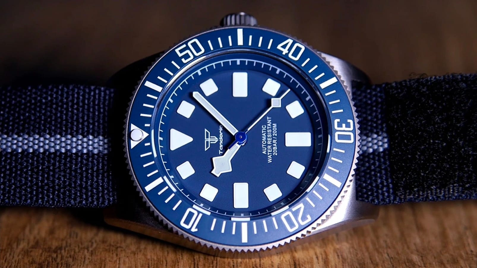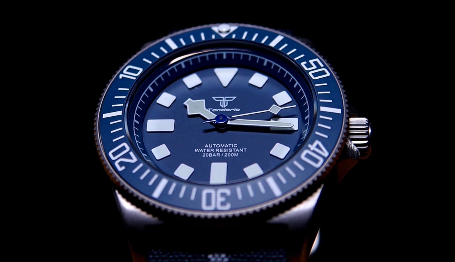 Branding is restrained: the Tandorio logo beneath 12, with Automatic and 200 m printed quietly above six. There is no date window, preserving symmetry and clarity. Lume is green, vivid, and generously applied, charging quickly and glowing with strong intensity—exactly what you’d expect from a tool watch derived from military specifications.