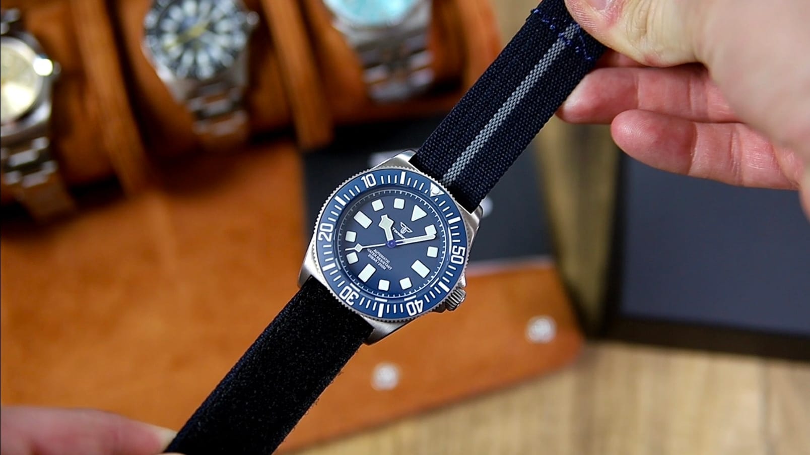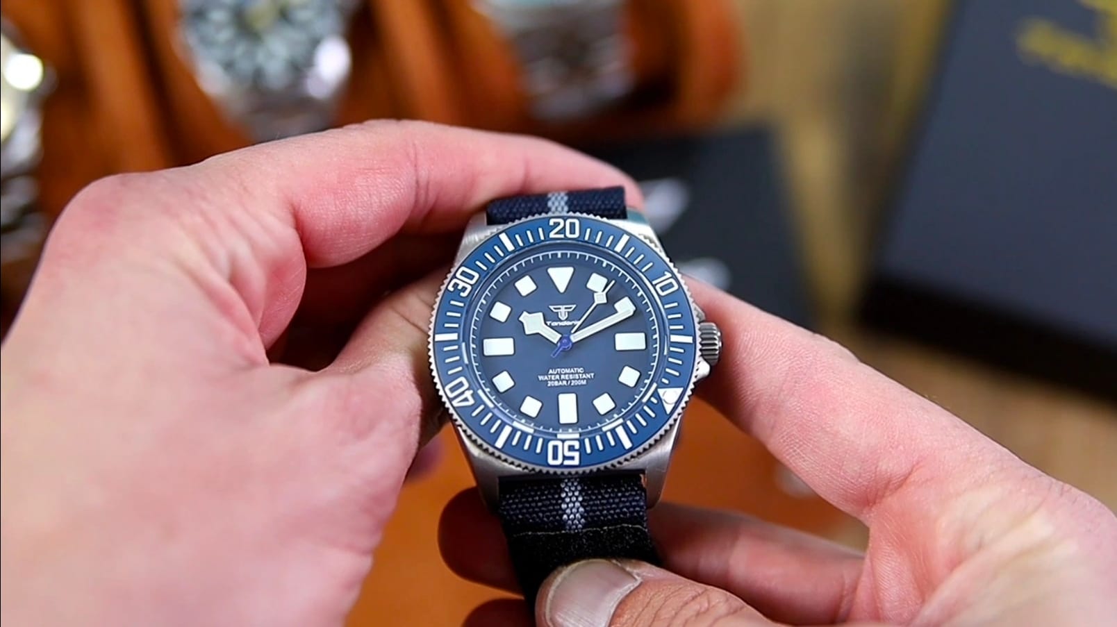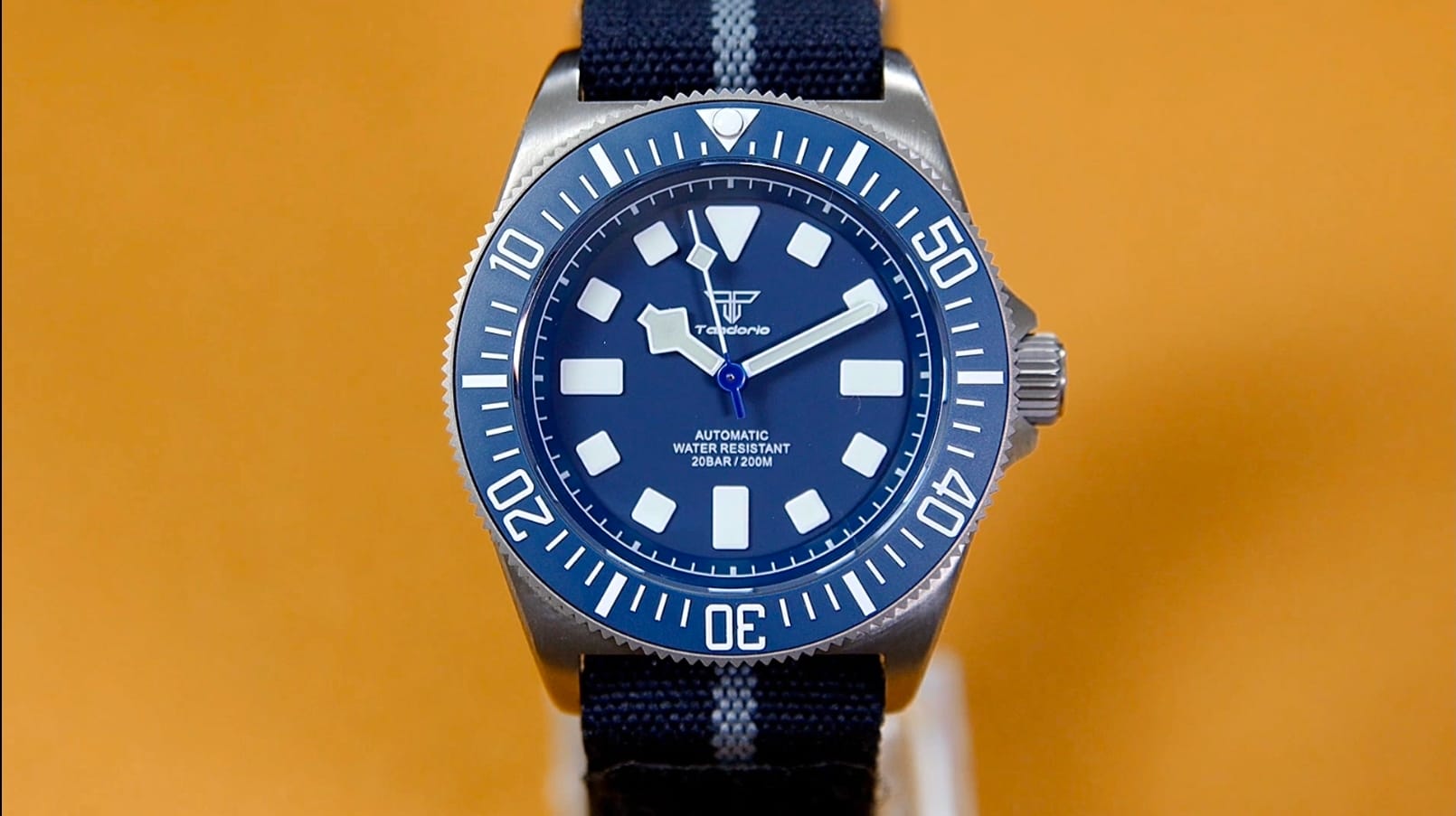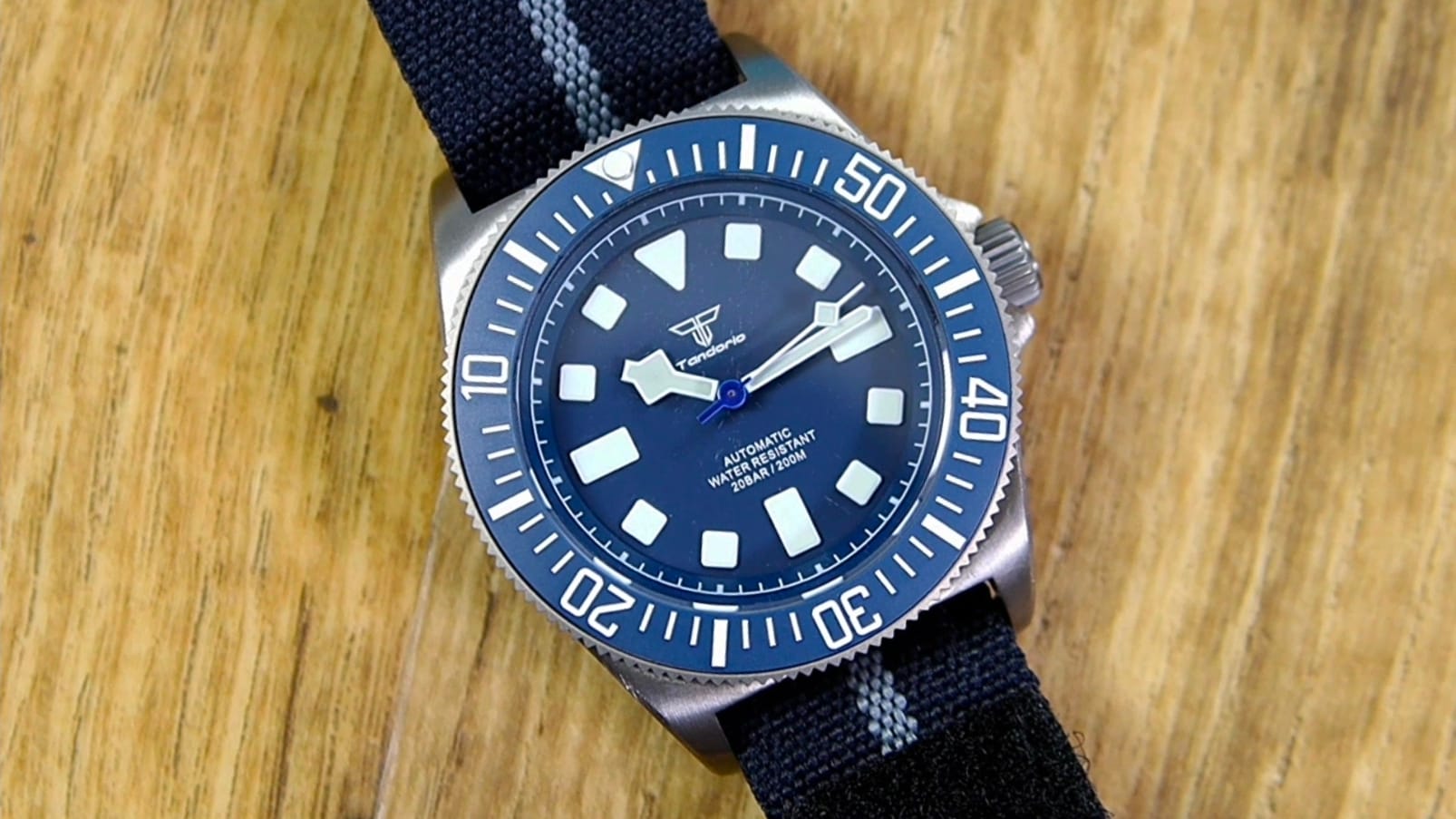 Branding is restrained: the Tandorio logo beneath 12, with Automatic and 200 m printed quietly above six. There is no date window, preserving symmetry and clarity. Lume is green, vivid, and generously applied, charging quickly and glowing with strong intensity—exactly what you’d expect from a tool watch derived from military specifications.