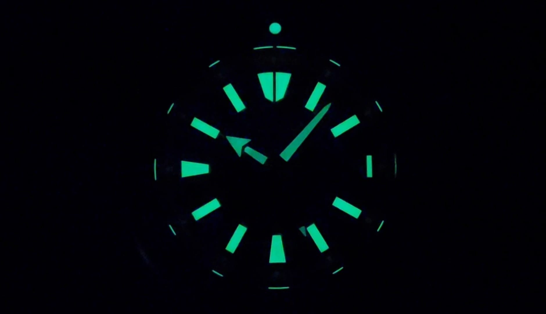 At 3 o’clock, a beveled date window is paired with a retained partial lume baton to preserve symmetry. Applied indices edged in chrome, along with arrow-style hands, provide strong contrast. The seconds hand features a lumed arrow tip for easy tracking. In low light, bright green lume illuminates the hands, indices, and bezel pip at 12.