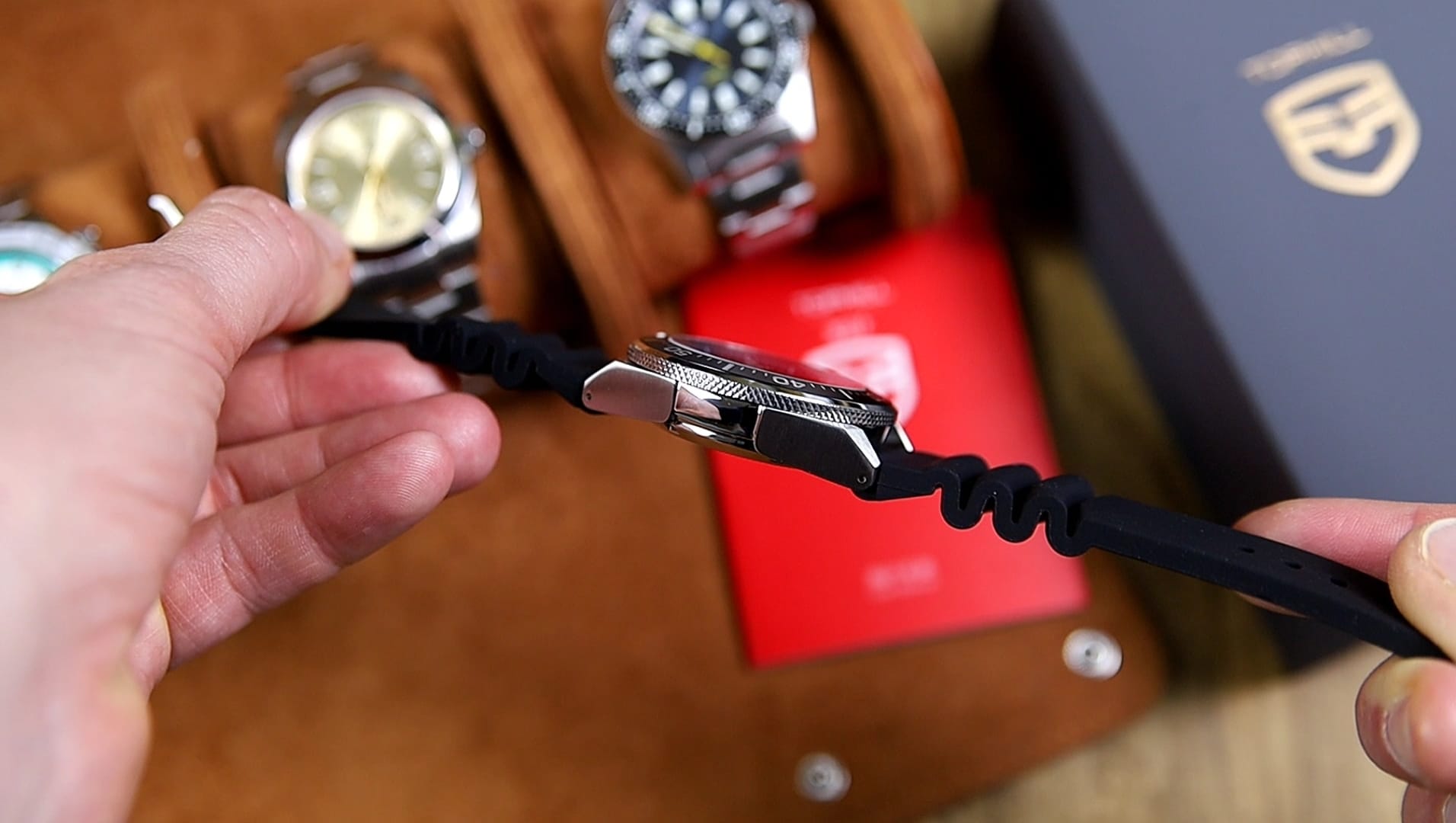 Rather than a bracelet, the TD008G is supplied on a rubber strap. In hand and on the wrist, the strap feels soft, supple, and comfortable, with a texture that avoids stiffness or an overly plasticky feel. It sits naturally against the wrist, making it suitable for extended wear despite the watch’s size and weight.