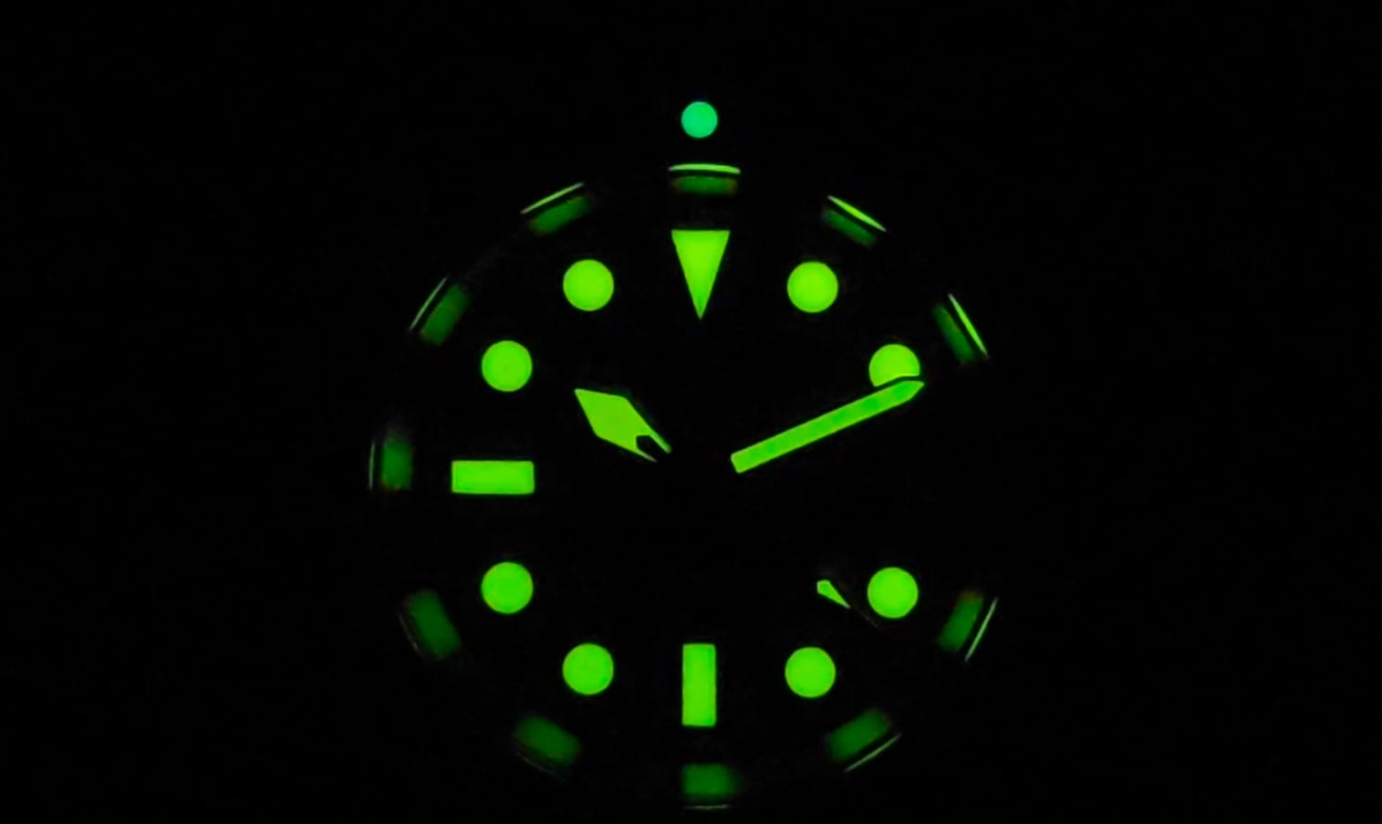 Lume application is consistent and bright. The green C3-type compound performs as expected — initially strong, tapering gradually over a few hours. All key markers, hands, and the bezel pip are coated evenly, maintaining legibility in low light.