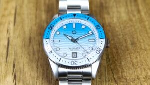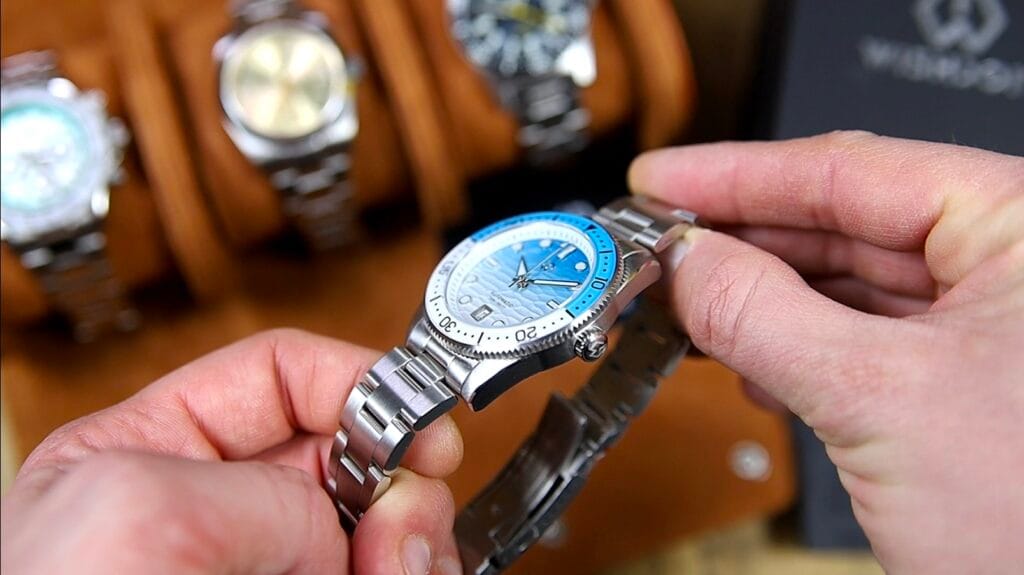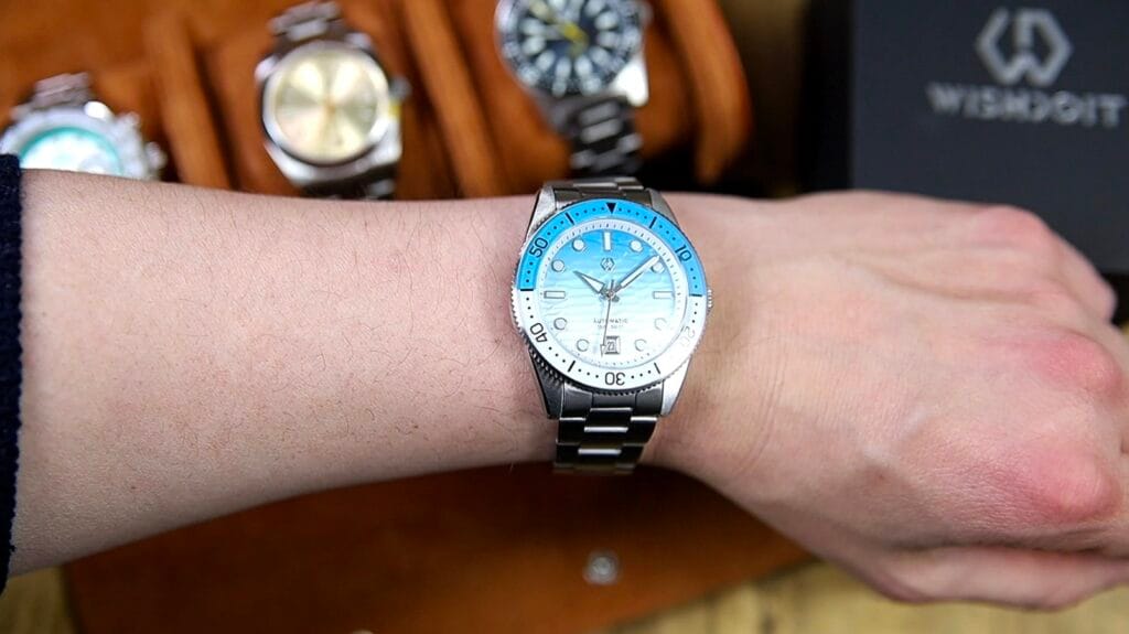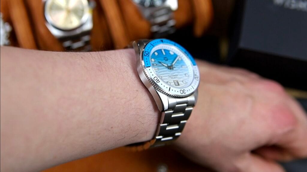 This is not a watch that aims to impress through ultra-tight tolerances or luxury-level finishing. Instead, it leans into fun—color play, surface texture, and a summer-ready aesthetic that immediately sets the tone. On the wrist, the watch feels balanced and composed, with proportions that work comfortably thanks to thoughtful case geometry. There are compromises, and they’re visible, but none are hidden. What the Wishdoit Ripple Dial offers is honesty: a solid, approachable diver that prioritizes dial impact and everyday wearability over technical perfection. This watch fits squarely into the modern diver watch segment, alongside others we’ve previously reviewed.