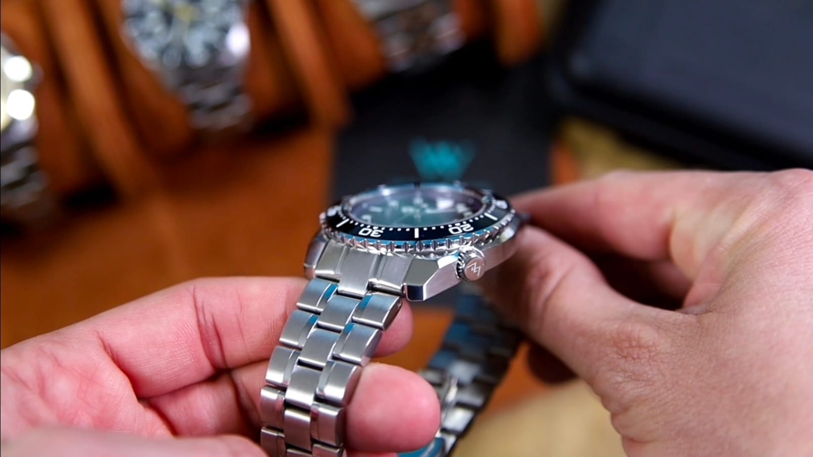 The screw-down crown measures 6.2 mm in diameter and is positioned at 4 o’clock, aligning visually with the date window. It is signed, well proportioned, and securely seated between integrated crown guards that are smoothly machined into the case. Grip is excellent, and engagement feels confident when threading the crown in and out.