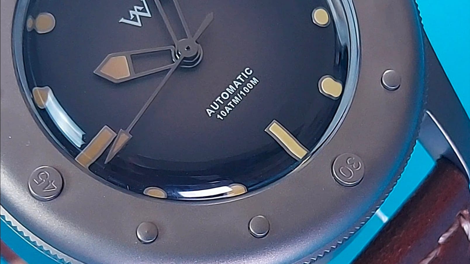 Indices are applied: batons at 6, 9, and 12, round lume plots for the remaining hours, and a date window at 3 o’clock that integrates neatly. The dial text is restrained — only the WM logo at twelve and Automatic 10ATM above six — letting the finish and depth do the talking.