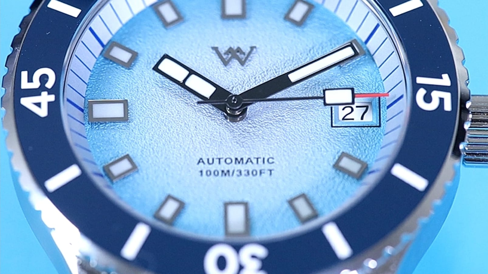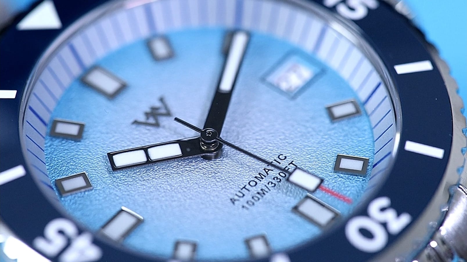 Applied indices are chrome-edged and filled with lume, maintaining symmetry with the Arabic numerals at 6, 9, and 12. The baton hands follow the same polished styling, while a framed beveled date window at 3 o’clock adds utility without clutter. Branding remains restrained: the WM logo below 12, and “Automatic” plus “100 m” above 6.