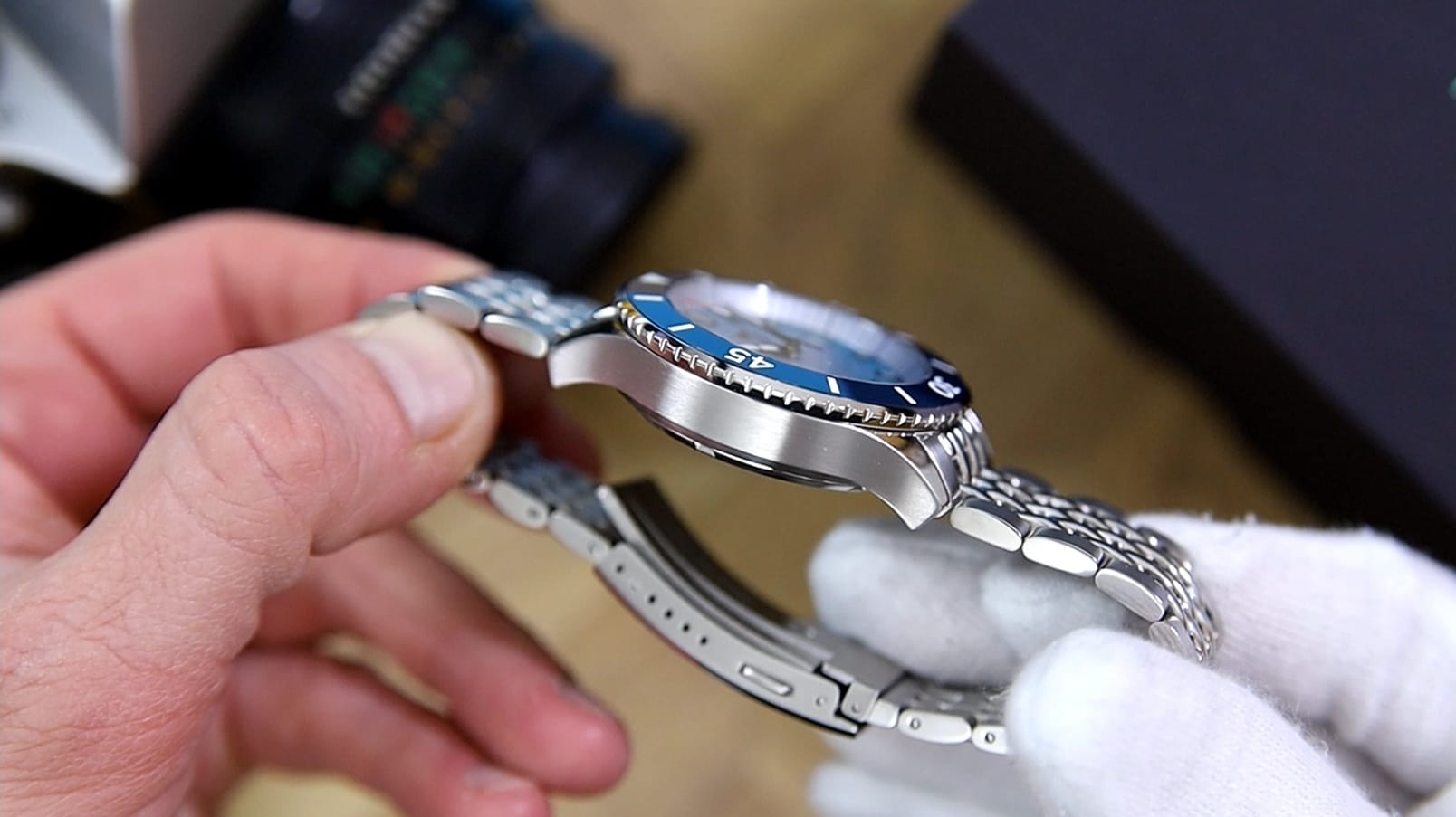 The 120-click unidirectional bezel is a highlight. Each click feels crisp, heavy, and positive, rivaling the tactile precision of far more expensive models. There’s virtually no back-play, and rotation resistance sits comfortably between firm and smooth — “Seestern or San Martin level,” as the transcript put it.