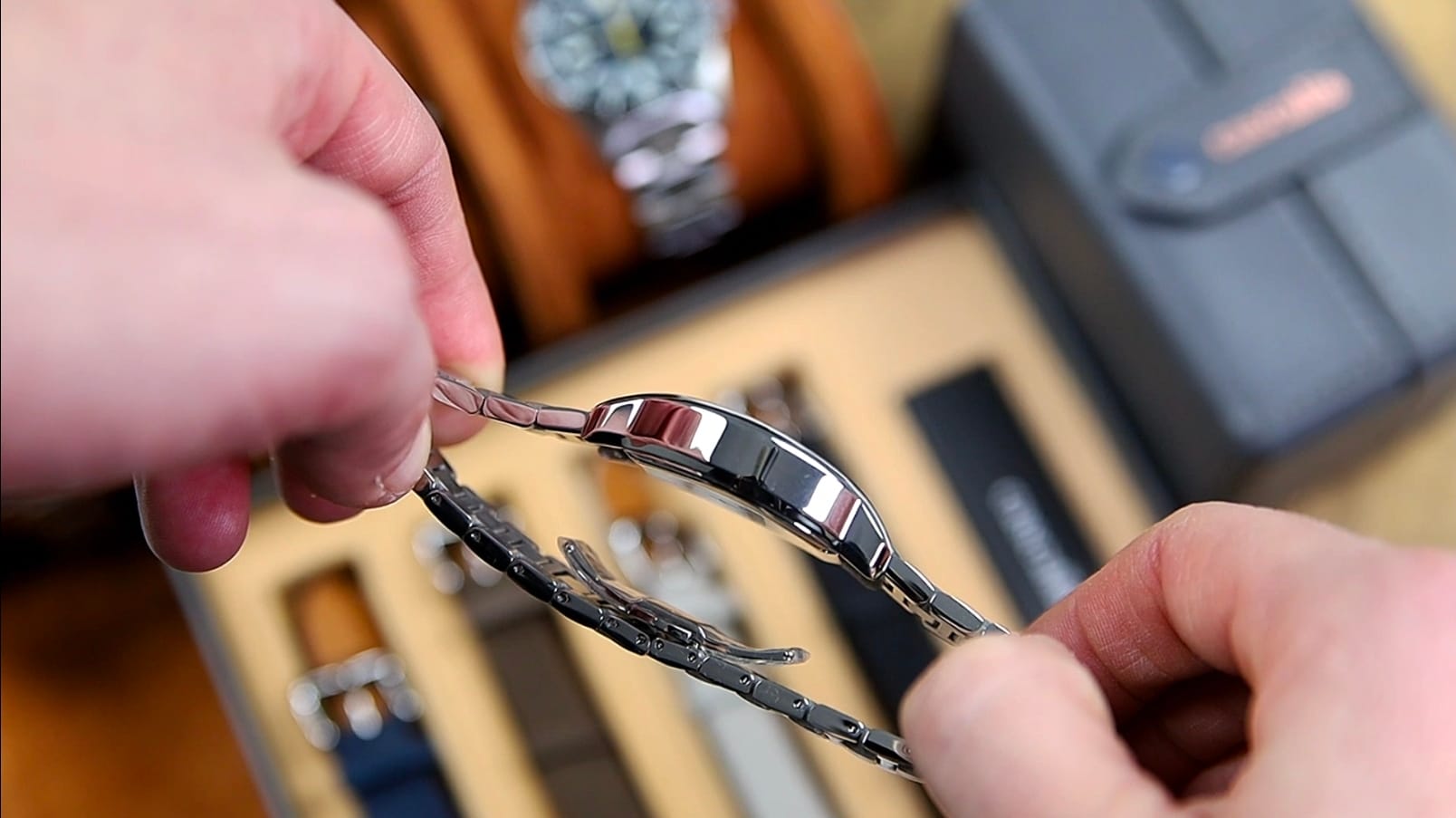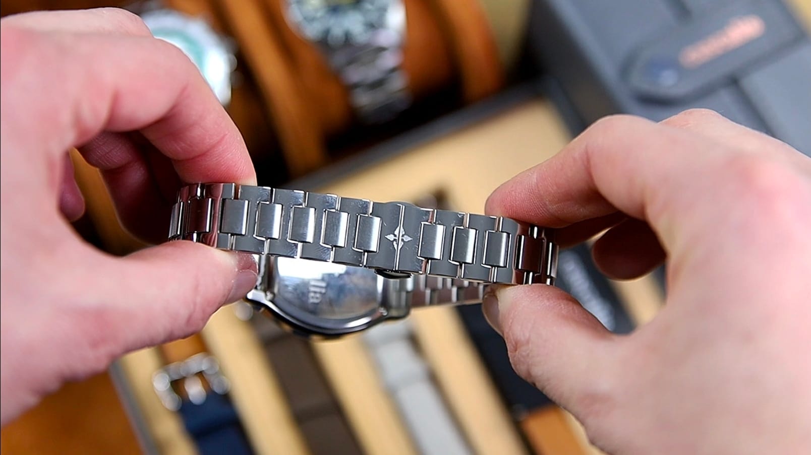 Construction relies on push pins rather than screws. The links are relatively short, simplifying sizing adjustments. On the wrist, articulation and fluidity are strong, allowing the bracelet to drape naturally. However, when flexed, some visible gaps between links appear, indicating tolerances that are acceptable but not exceptional.
