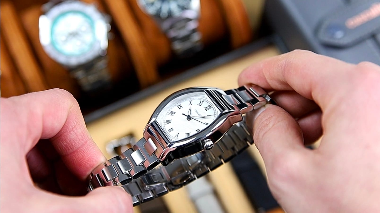The Caratello stands out through its tonneau case shape, curved sapphire crystal integrated without a traditional bezel, and highbeat Miyota 9015 movement. Combined with multiple strap options and a travel case, it presents a complete, design-focused package rather than relying solely on mechanical specification.