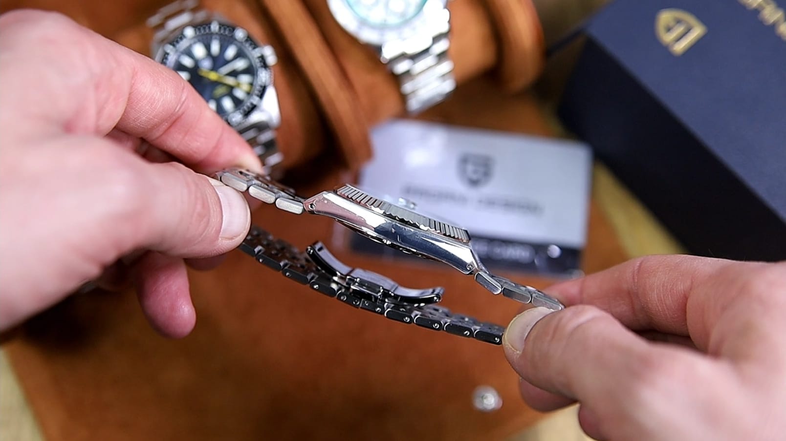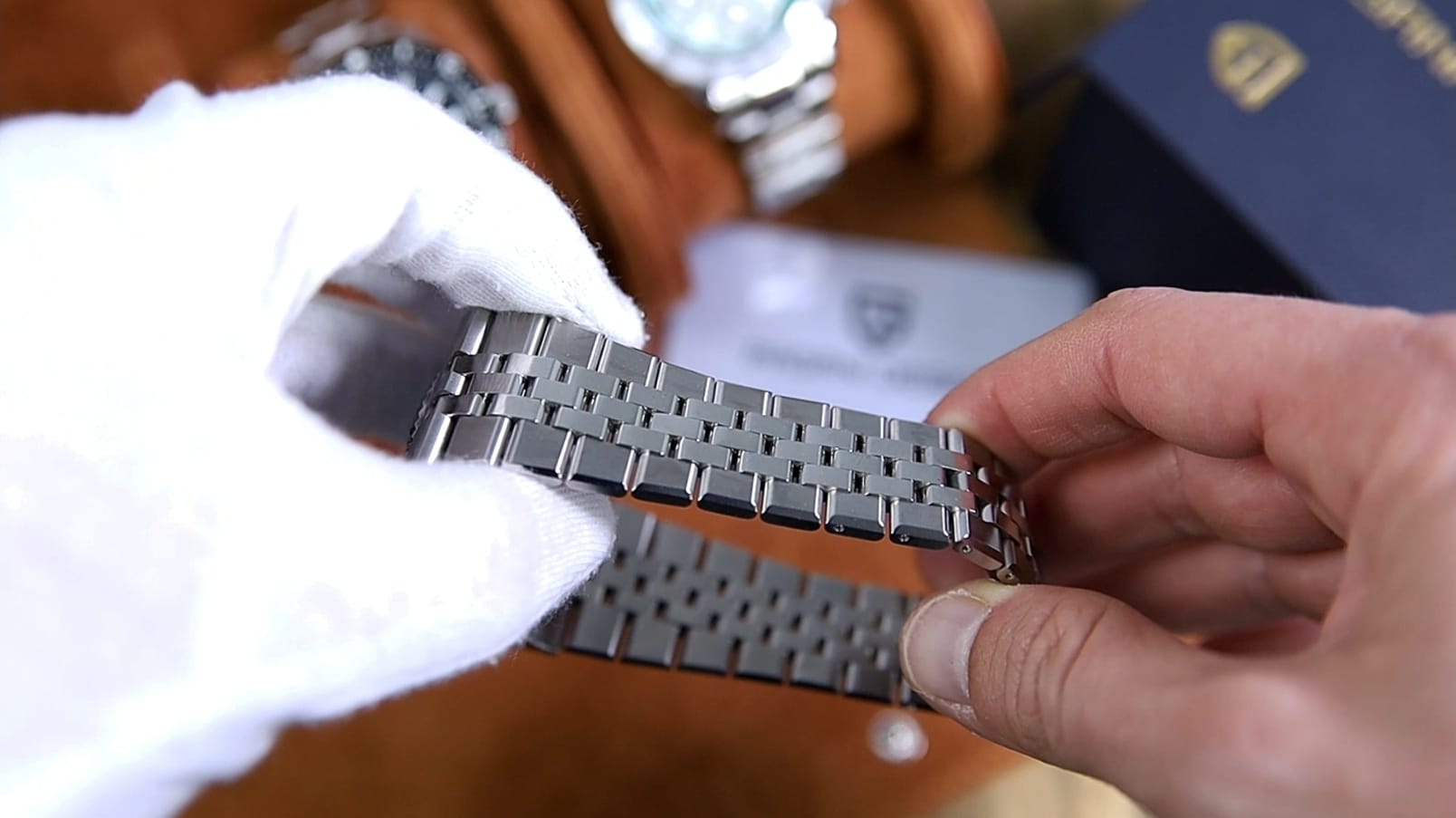 Pagani equips the PD-YS027 with an integrated five-link stainless-steel bracelet. The outer links are brushed, while the slim central links are polished, producing a vivid interplay of light. Each edge receives a 45-degree polished bevel, softening what used to be harsher Pagani bracelets.