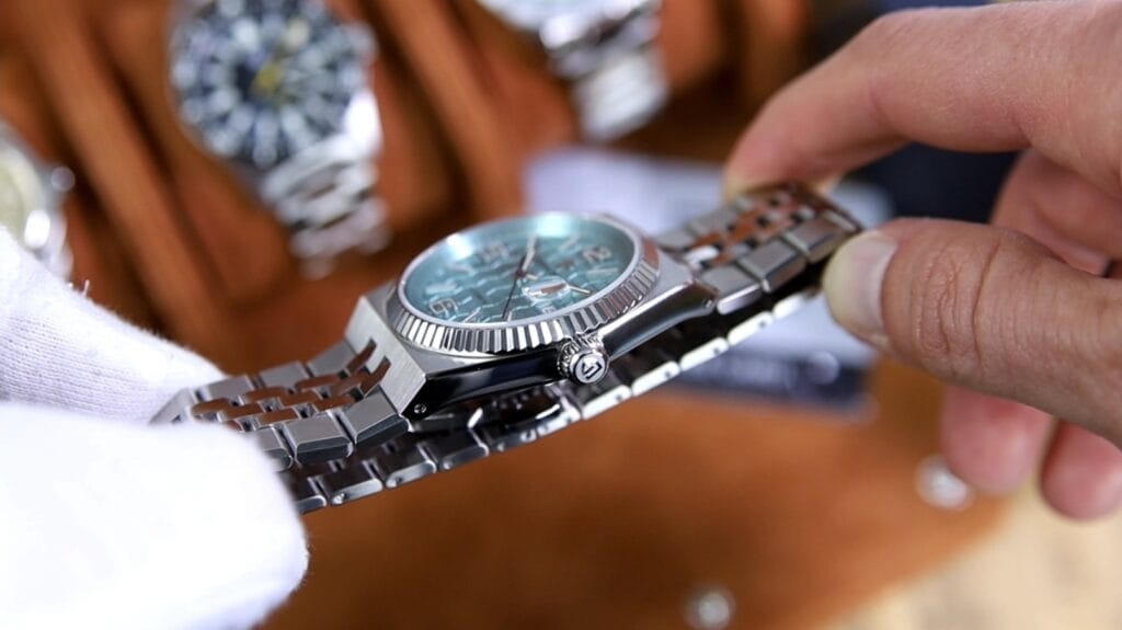 Inside, an inward-sloping rehaut carries a printed minute track that draws the eye to the dial’s star feature: a “100-rhombus” texture engraved into the surface. Each tiny cell catches light differently, producing waves of reflection that shift from ice blue to pale turquoise.