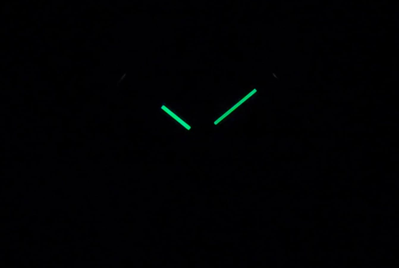 The slim baton hands are lume-filled, while the indices are not. Lume performance is minimal but adequate for very short-term night-time readability.