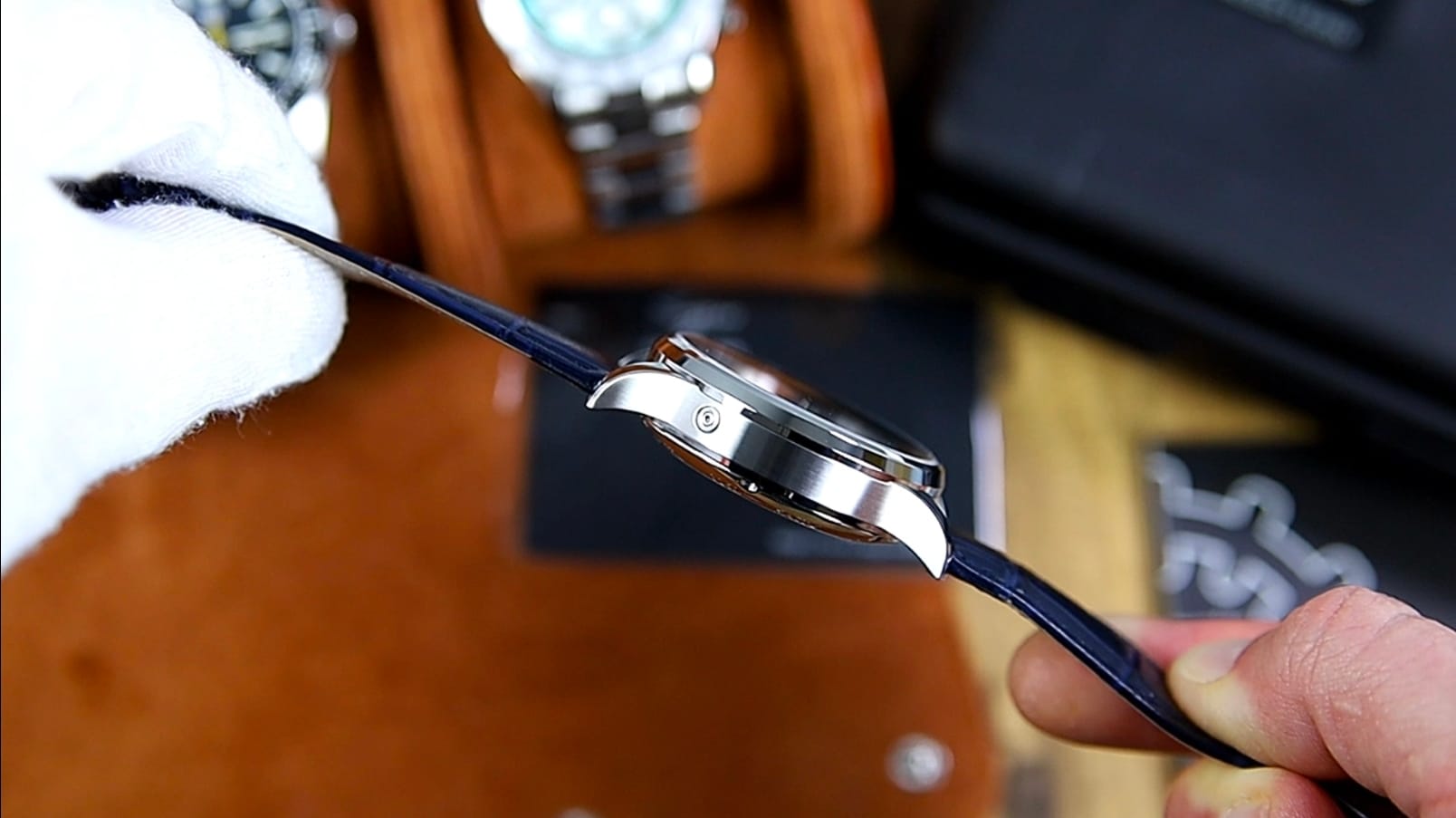 The watch comes fitted with a navy blue padded leather strap, embossed with a crocodile-grain texture and matching stitching. It’s supple yet substantial, tapering gently for comfort. On the underside, a beige lining confirms genuine leather, stamped accordingly.