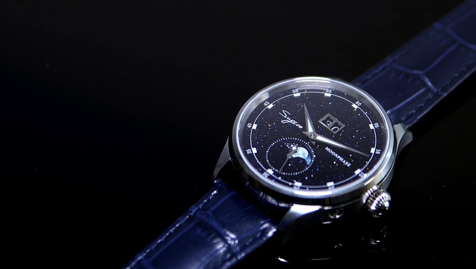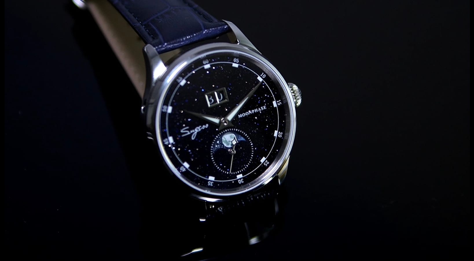 The star of the Sugess Moonphase is, quite literally, its blue sandstone dial — a natural mineral surface flecked with reflective metallic particles that shimmer like stars in a midnight sky. No paint, no printing — just nature’s texture, creating organic variation that makes each piece unique.