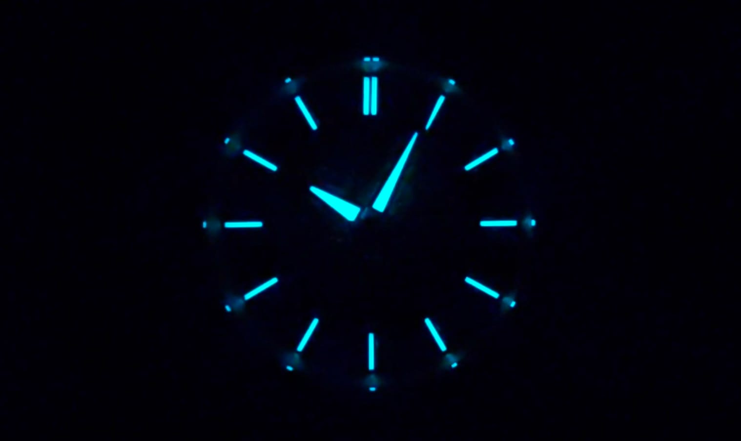Lume performance is consistent across the hands and applied indices. The BGW9 blue glow is bright initially and settles into a steady, usable level rather than a dramatic one. The application is even, and the layout makes nighttime legibility straightforward without overemphasizing the effect.