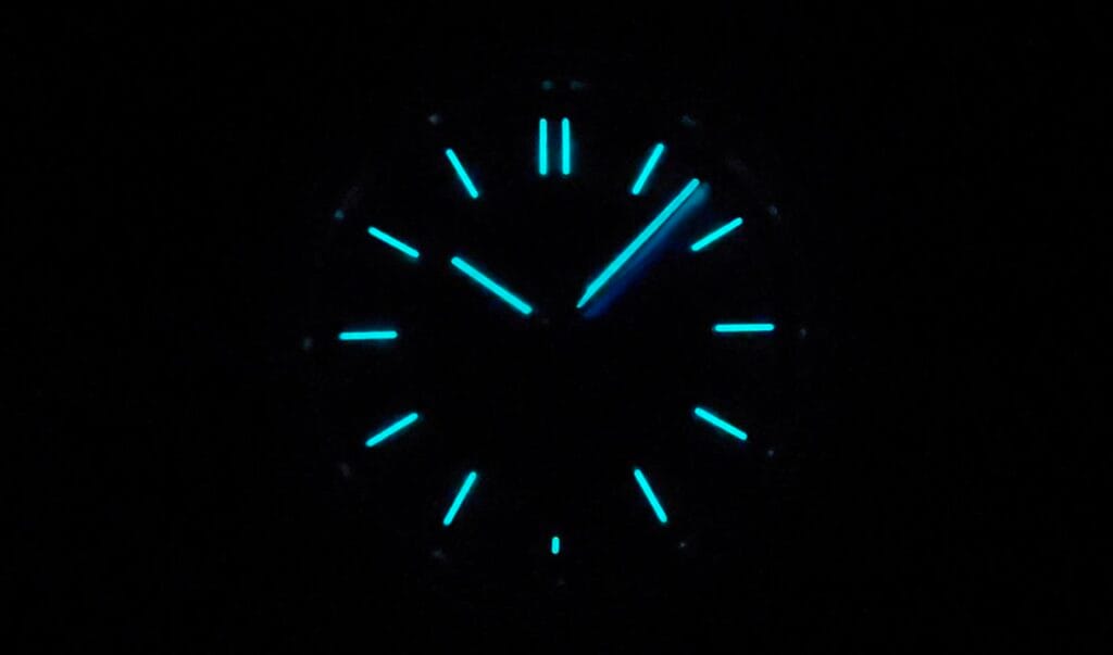 Legibility is maintained through slim chrome hands filled with lume. Their fine profile sits comfortably against the textured background without visually clashing. Lume performance is consistent: a blue glow across hands and indices, bright initially and then settling into steady nighttime visibility.
