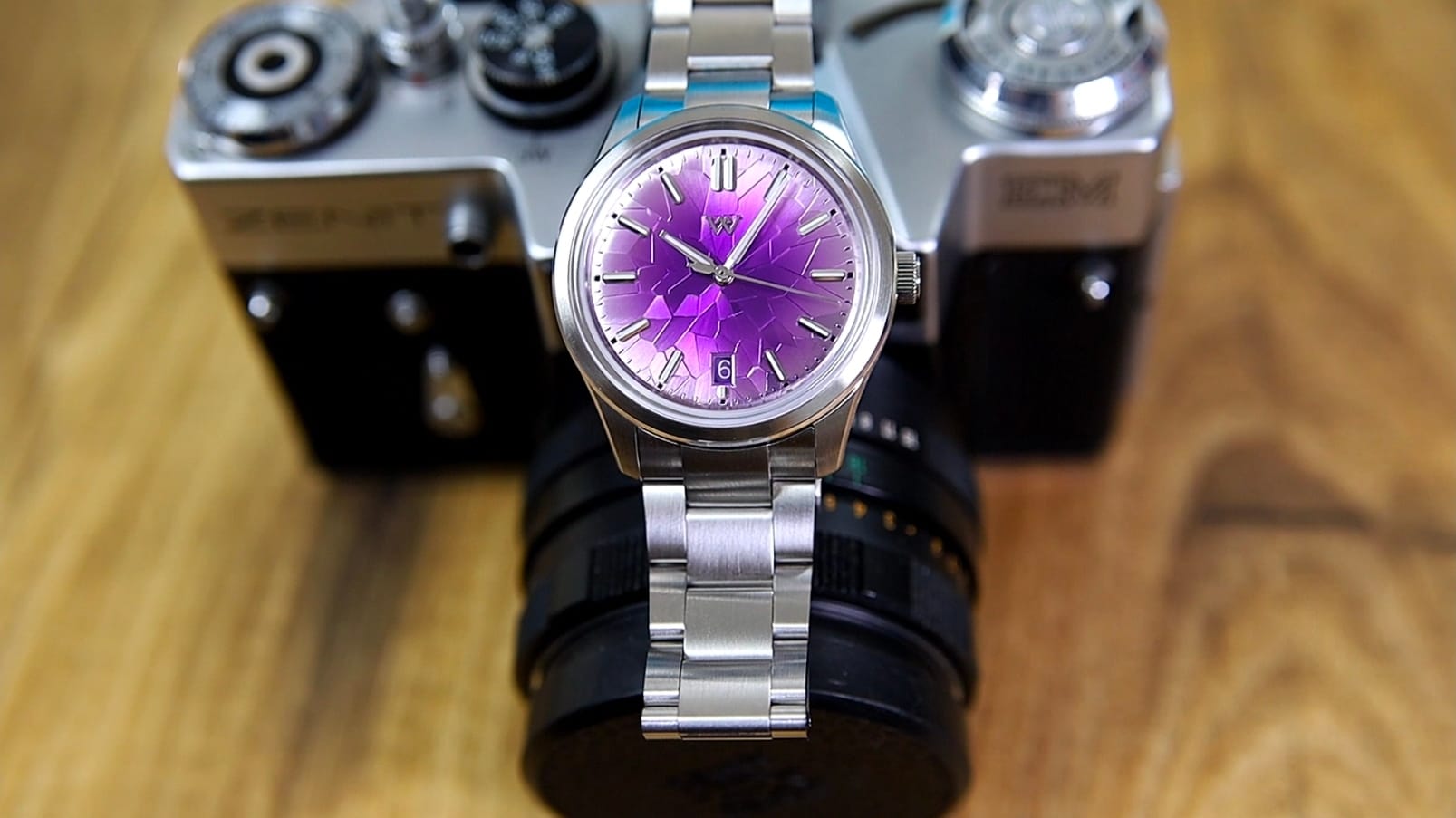 The Glacier dial uses a layered, cracked-ice texture, producing dimensional shifts as light moves across the surface. Three color variants exist — Ice Blue, Aurora Red, and Aurora Purple — with the latter reviewed here. The texture is not printed but structured, giving the pattern a more physical quality.
