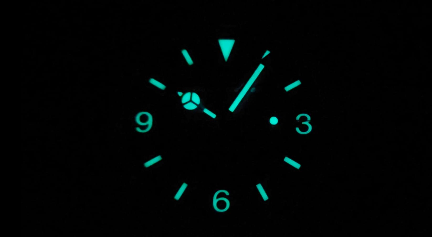 Beneath the crystal, the dial serves as the quiet centerpiece. A matte black background provides high contrast against crisp white indices and hands. Lume performance is a familiar Addiesdive strength, with a bright, evenly applied blue glow across hour markers, hands, and the lollipop-style seconds hand. A clean white printed minute track runs around the periphery, while applied Arabic numerals appear at 3, 6, and 9, paired with a downward-pointing triangle at 12 and elongated applied batons elsewhere. These markers are matte white rather than chrome-edged, reinforcing clarity and a field-ready feel. The dial’s subtle waffle texture is pressed rather than printed, adding genuine depth and a refined retro-military character. Branding appears beneath 12 in cursive script, with “100 m” printed above six, completing a balanced, uncluttered layout.