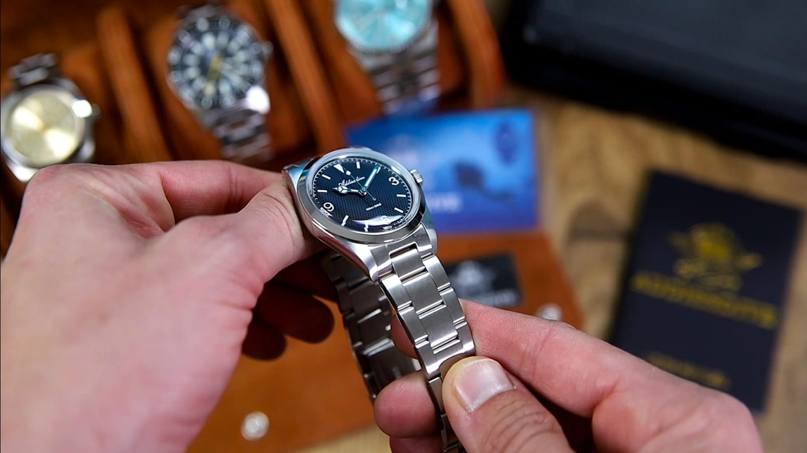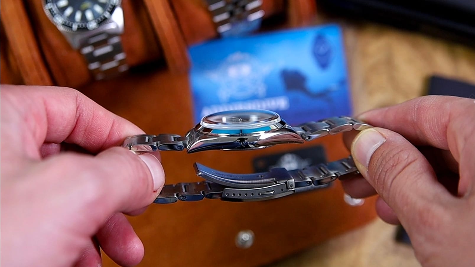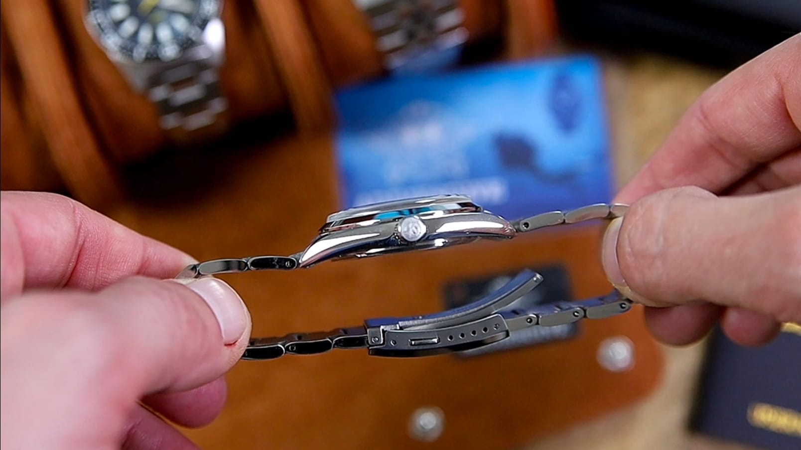 Link articulation is smooth and fluid, contributing to an easy, comfortable wear experience. The bracelet uses push pins, but overall construction feels robust. The clasp elevates the experience further. It is fully milled, signed, and finished with polished bevels along the edges for a subtle visual lift. A double-pusher release secures the closure, while inside, a milled folding wing reinforces durability. Five micro-adjustment positions allow for precise fit tuning, rounding out a bracelet that feels both functional and thoughtfully executed for a sub-$60 watch.