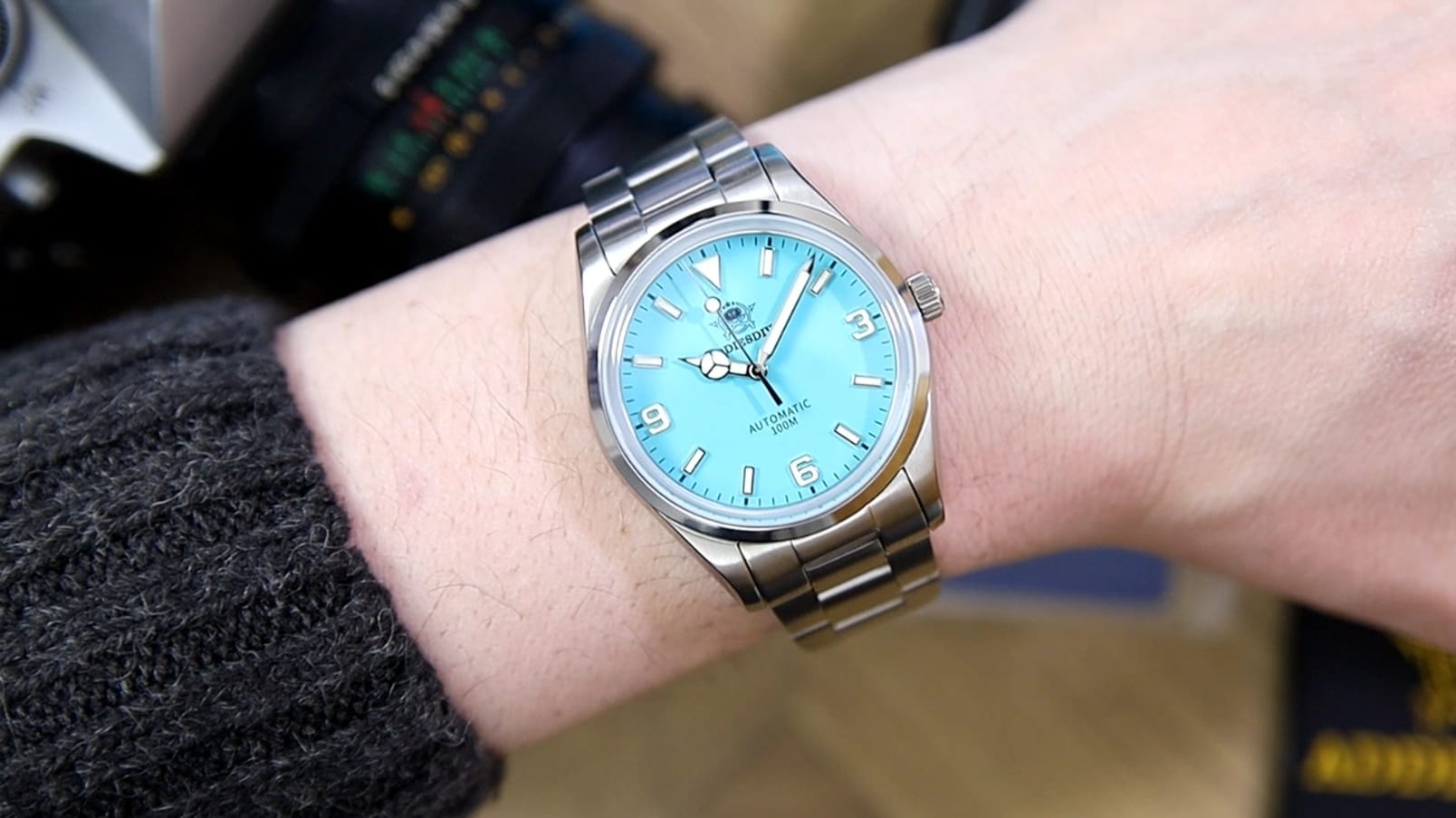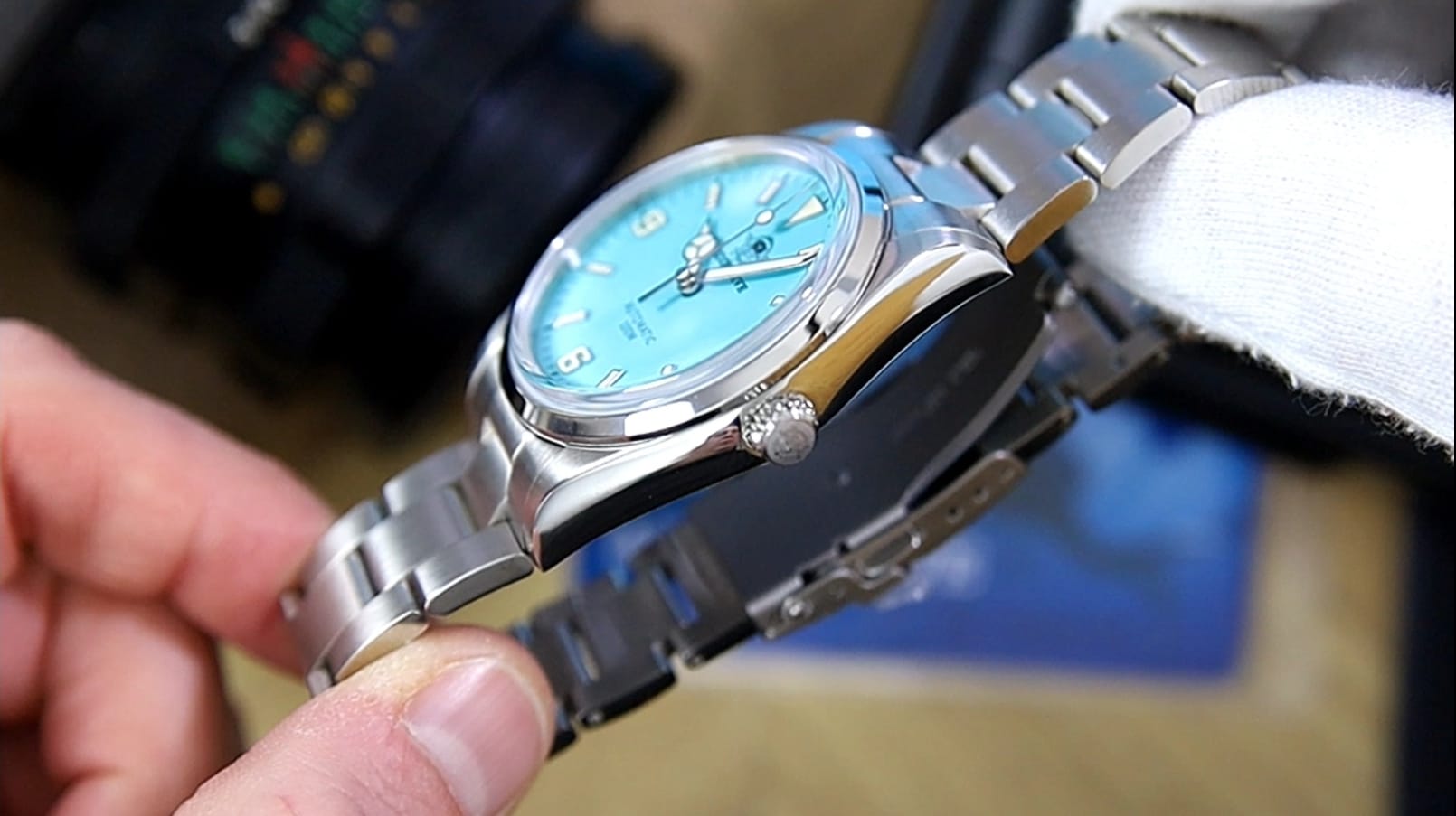 The angled lug hoods reduce visual length, helping the watch sit flat and comfortably — even on a 6.5-inch wrist, as tested. The interplay between brushed lugs, polished bezel, and the boxed crystal gives the watch layered visual depth, while the sky-blue dial adds a contemporary, summery tone that balances the Explorer-inspired form.