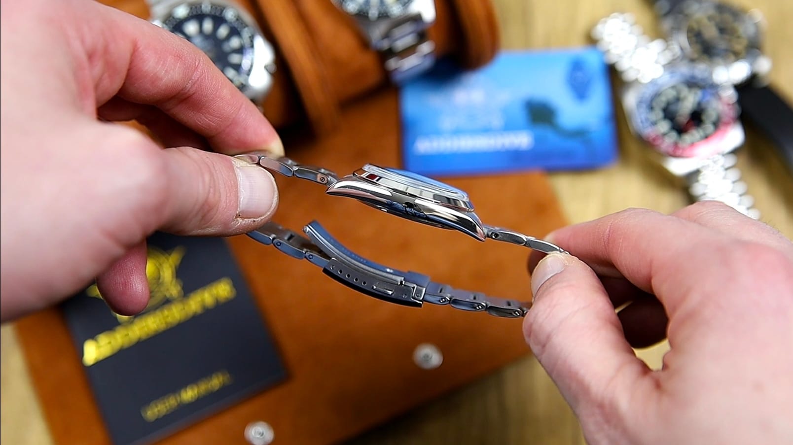 The clasp improves the overall feel, featuring a signed stainless steel unit with a double push-button release. Inside, a milled folding wing adds a sense of solidity that goes beyond the bracelet’s otherwise budget-oriented construction.