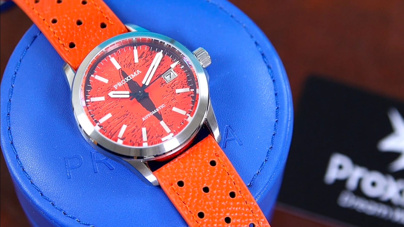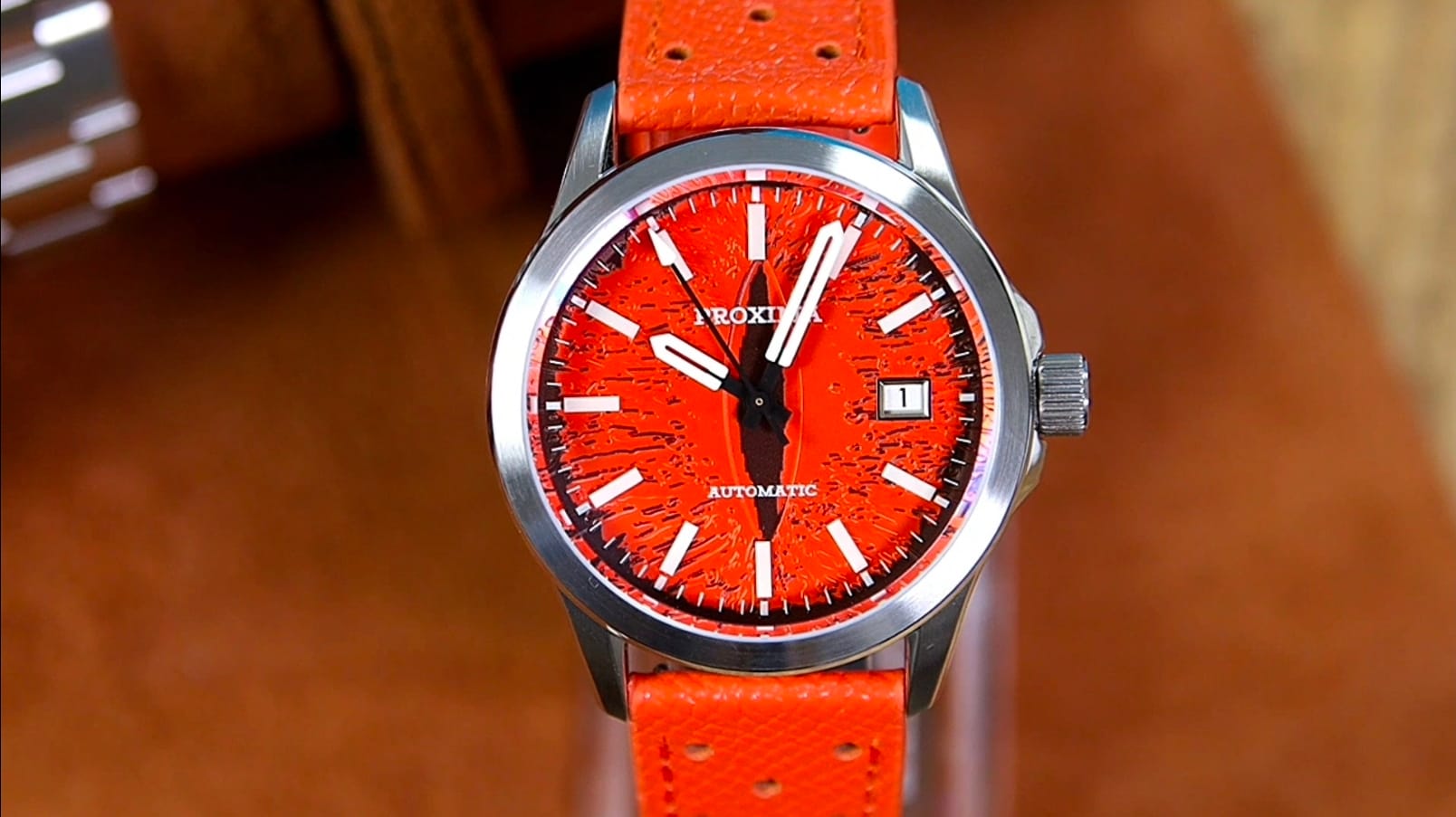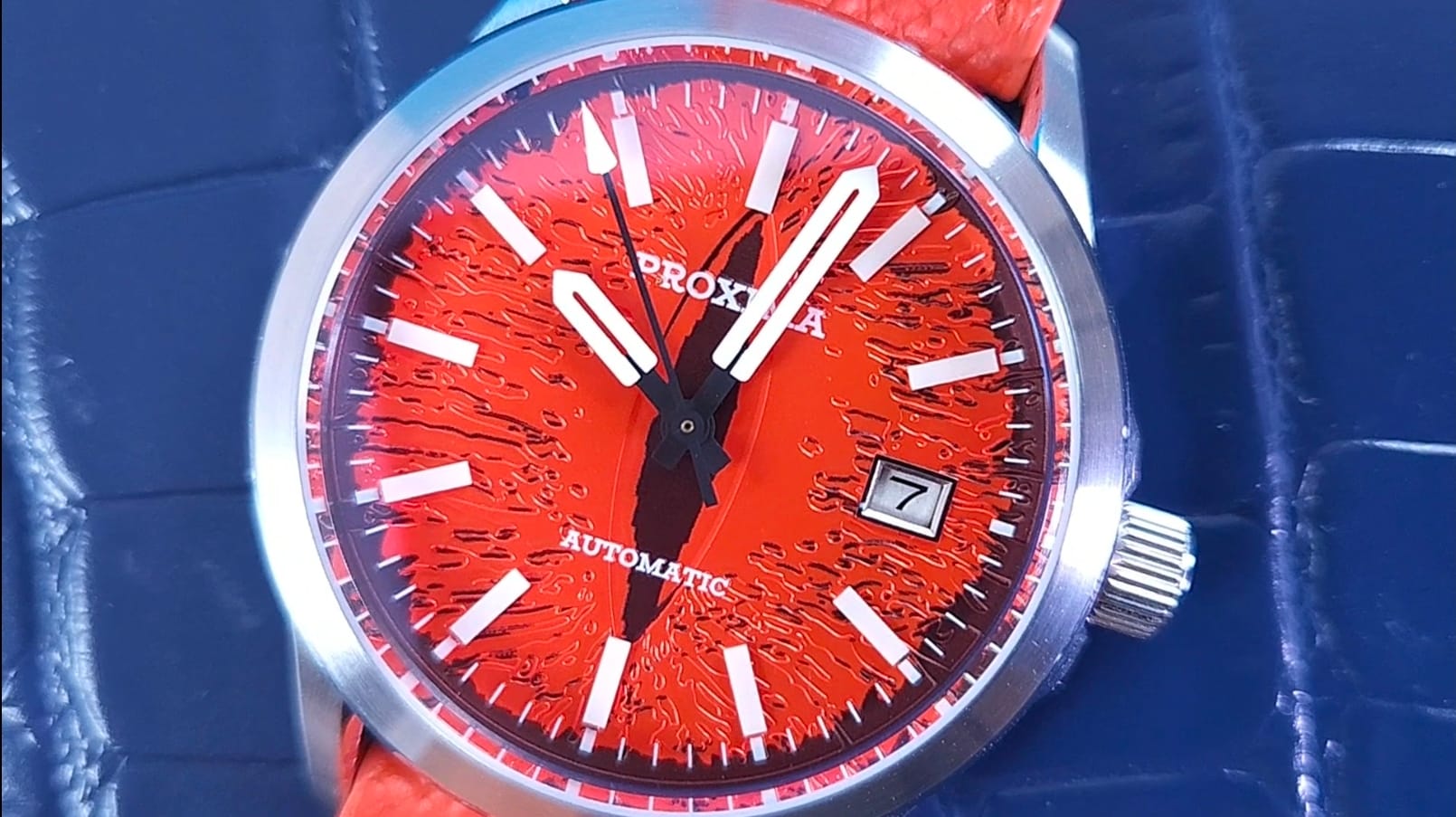 Proxima refers to this as an “oil-pressed” dial. Rather than sunburst or gradient finishing, pigment is compressed under pressure, creating radiating slivers and micro-bursts of colour. The effect originates from a recessed, elliptical iris-like centre, producing a dramatic “dragon’s eye” or molten pupil appearance. A black base layer underpins a flame-orange overlay, with hints of the darker undercoat visible at certain angles. Seen in isolation it stands well, but comparisons help sharpen the picture.