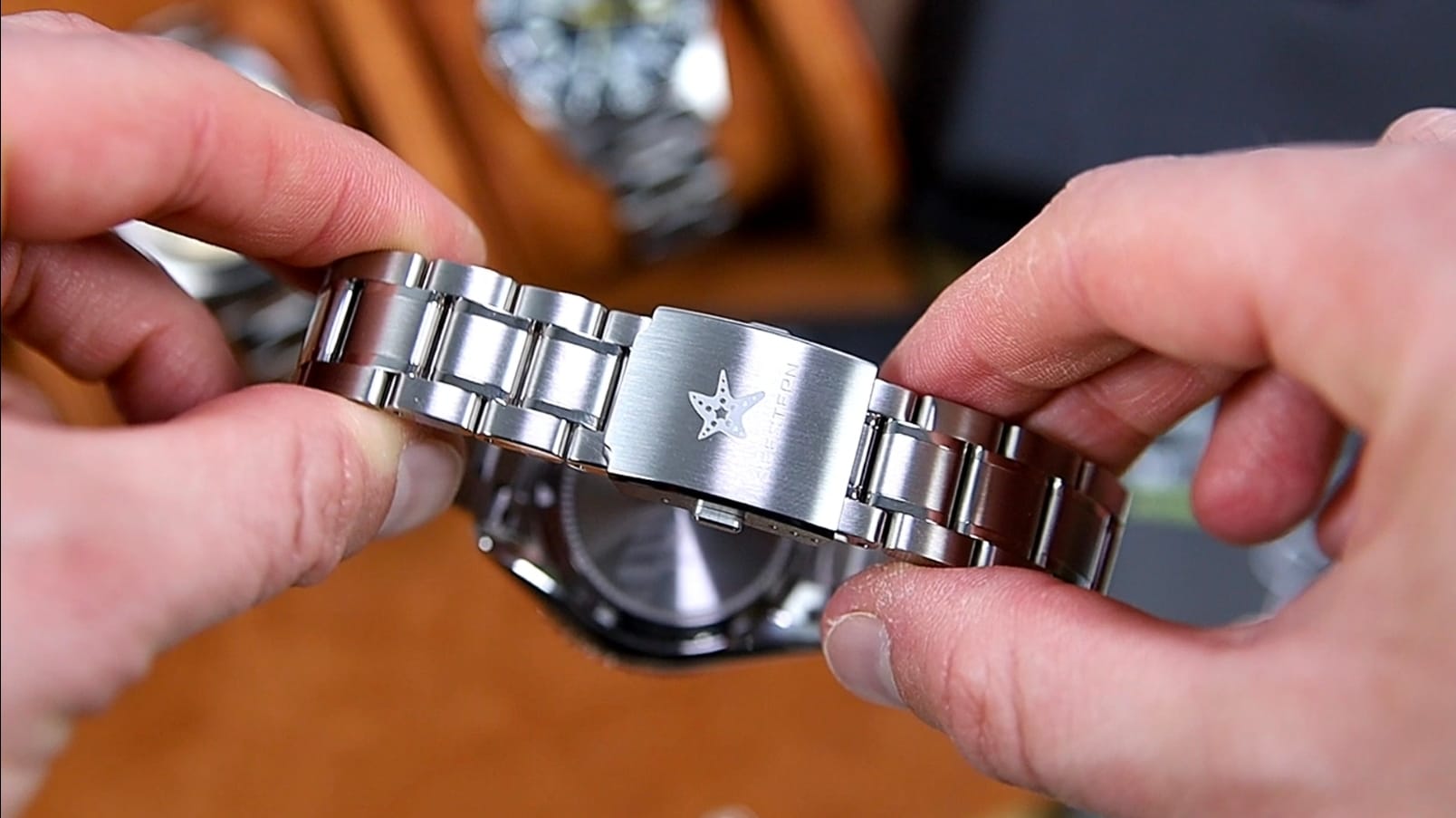 The screw-down crown is integrated between guards, and tolerances around the crown and end links appear consistent with mid-range microbrand construction.
