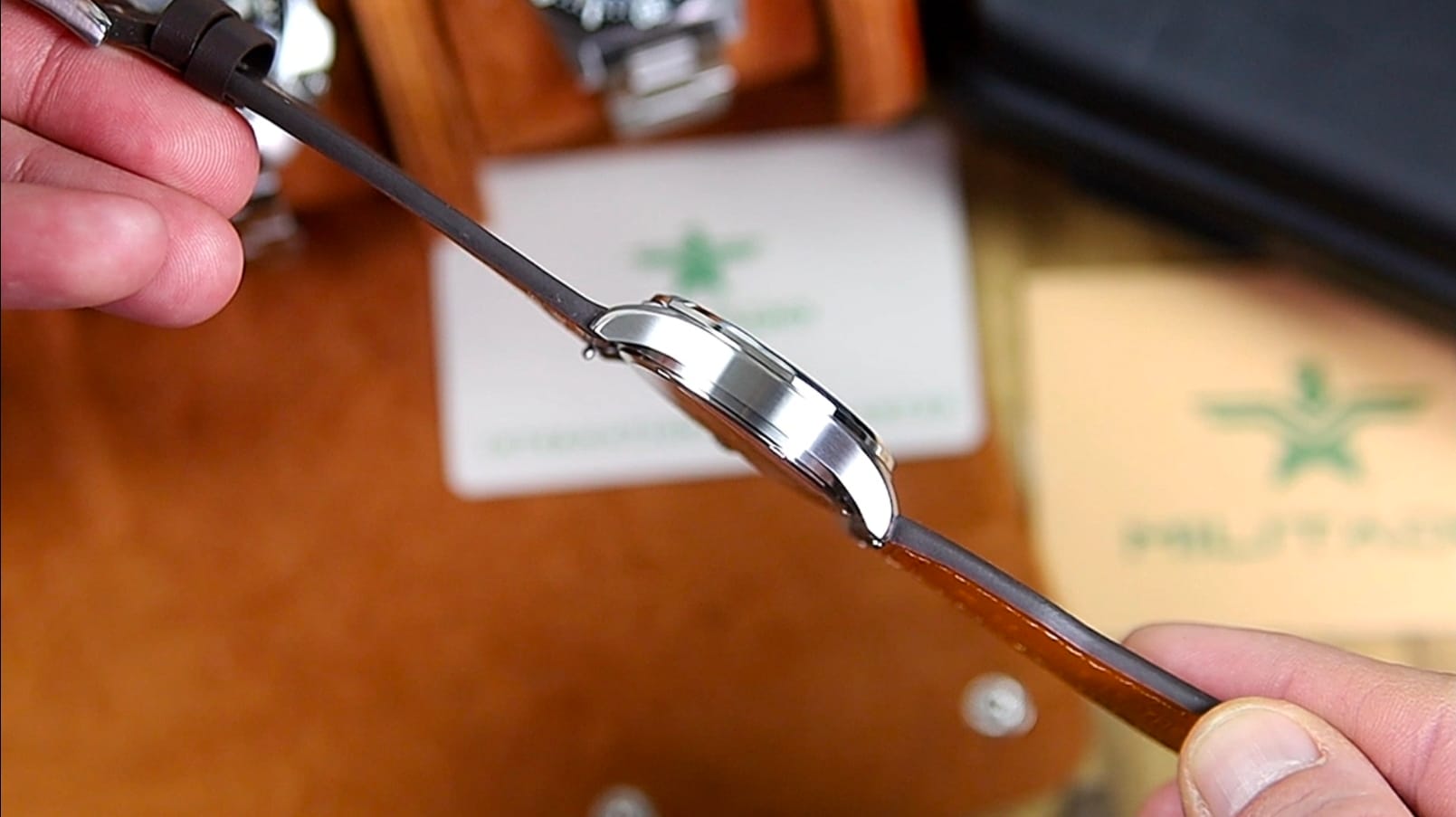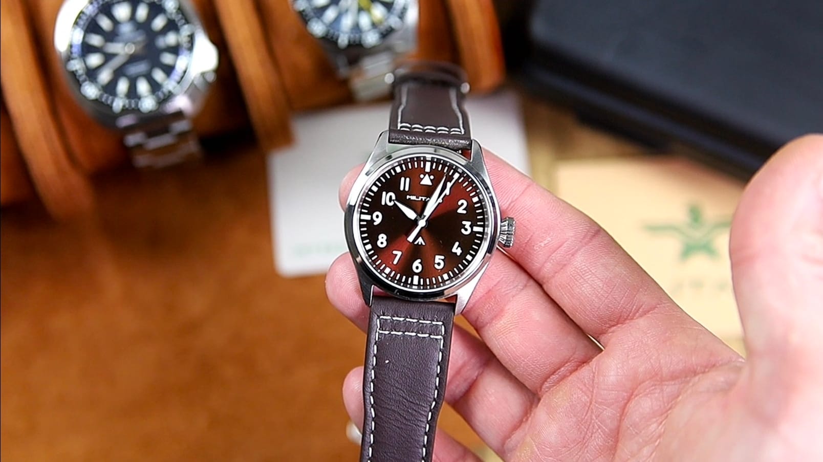 The ML21 is fitted on a brown leather strap, which keeps the overall presentation simple and in line with the watch’s field-style character. The leather surface is clean and unpadded, without additional patterning, allowing the material itself to carry the visual weight.